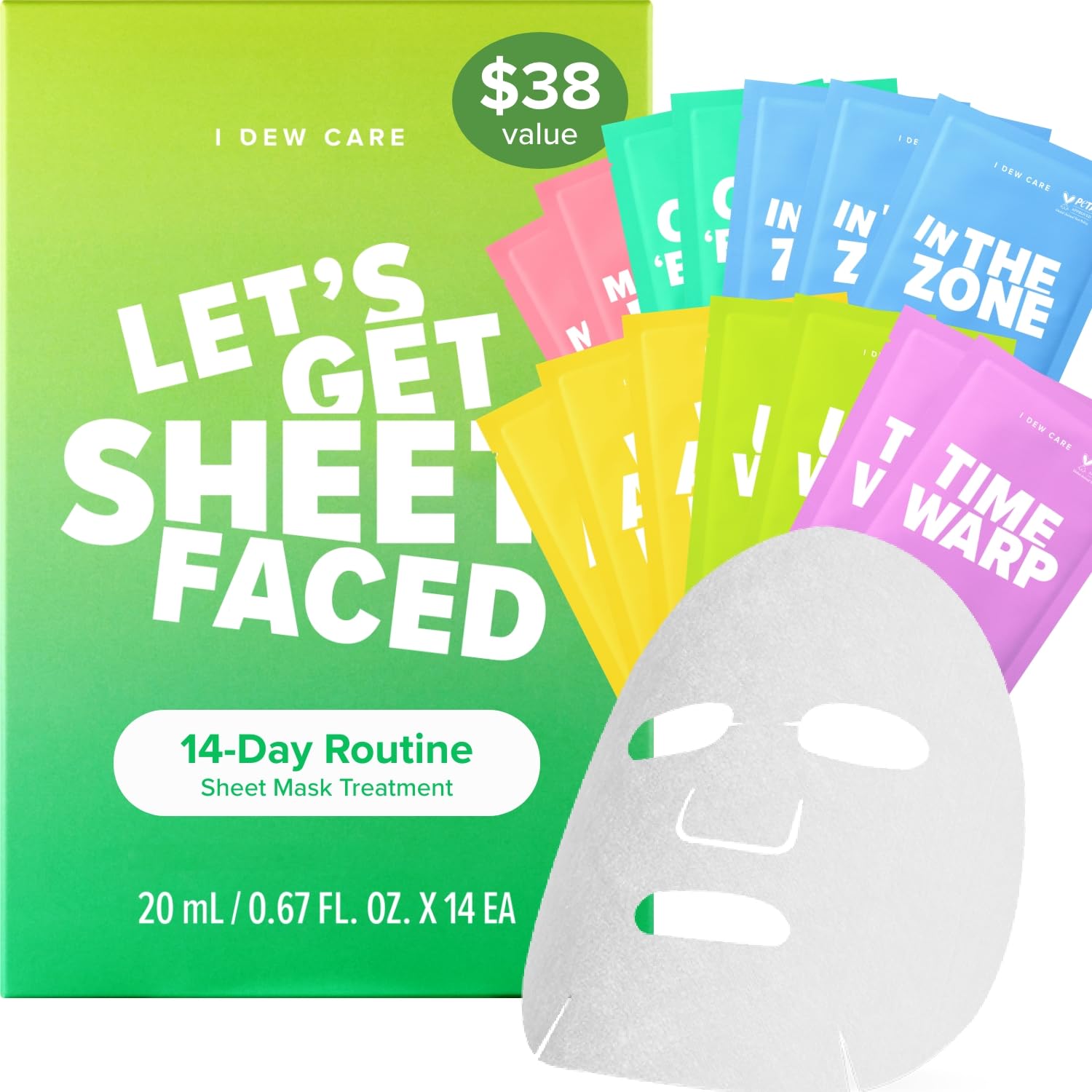 I DEW CARE Glass Skin Facial Sheet Mask Variety Pack - Let's Get Sheet Faced | 14 Days Facial Masks Set, Moisturizing Face Masks Skincare, Korean Face Mask, Hydrating Collagen Face Mask, 14 Count