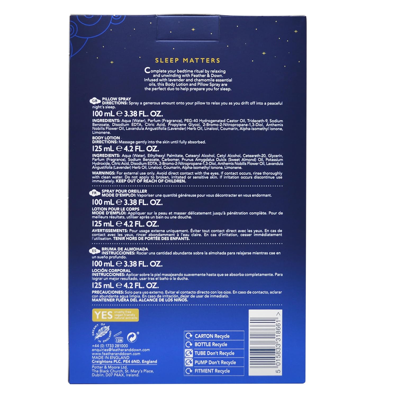 - Lavender Sleep Duo: Our Feather and Down Relax & Unwind Gift Set includes a 100ml pillow spray and a 125ml body lotion, both infused with the calming scents of lavender and chamomile essential oils