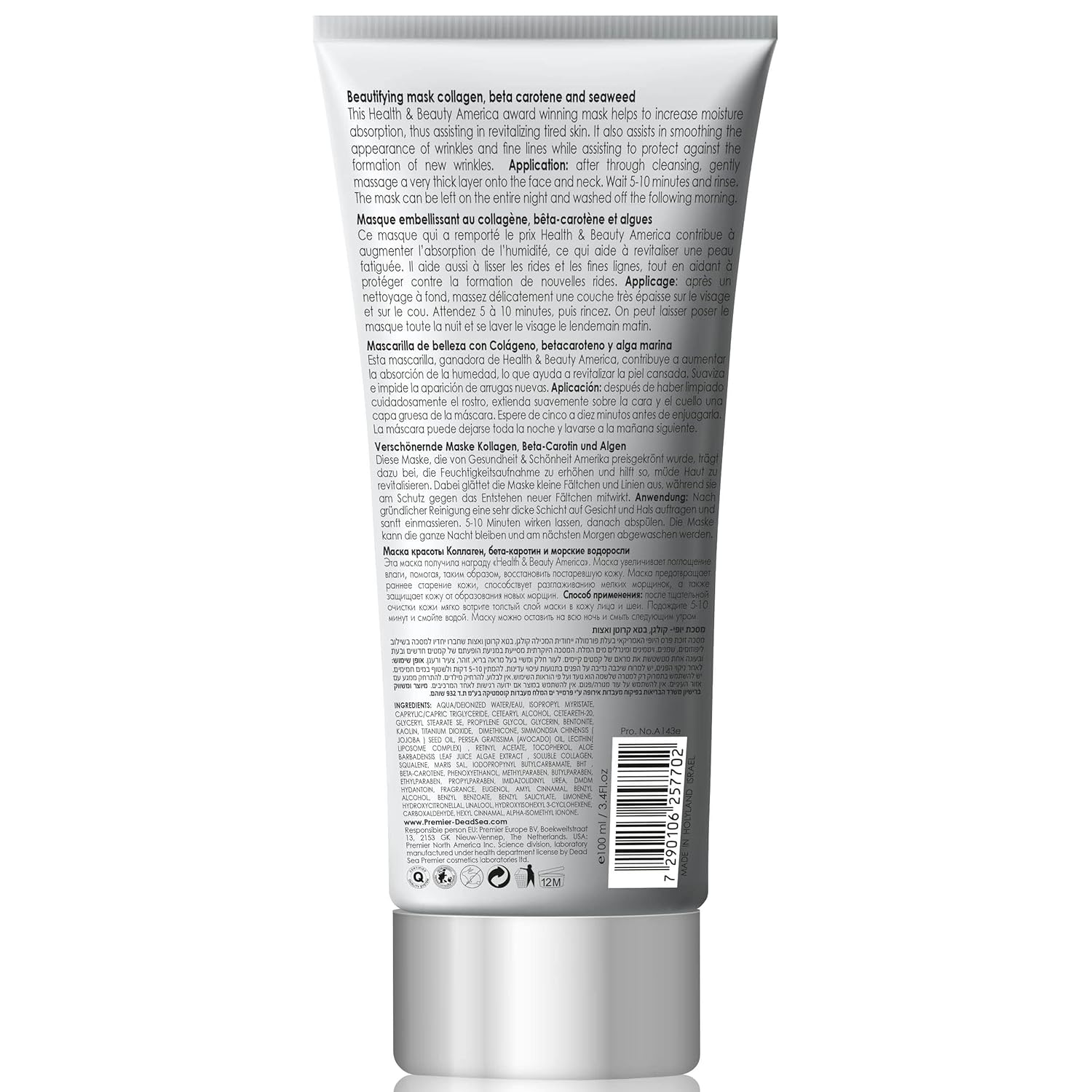 Premier Dead Sea Classic Beautifying Mask Collagen, Beta Carotene And Seaweed Reduces Blackheads, Pores, Acne, Oily Skin - Visibly Healthier Face & Body Complexion - All Natural Anti-Aging 4.4 Fl Oz