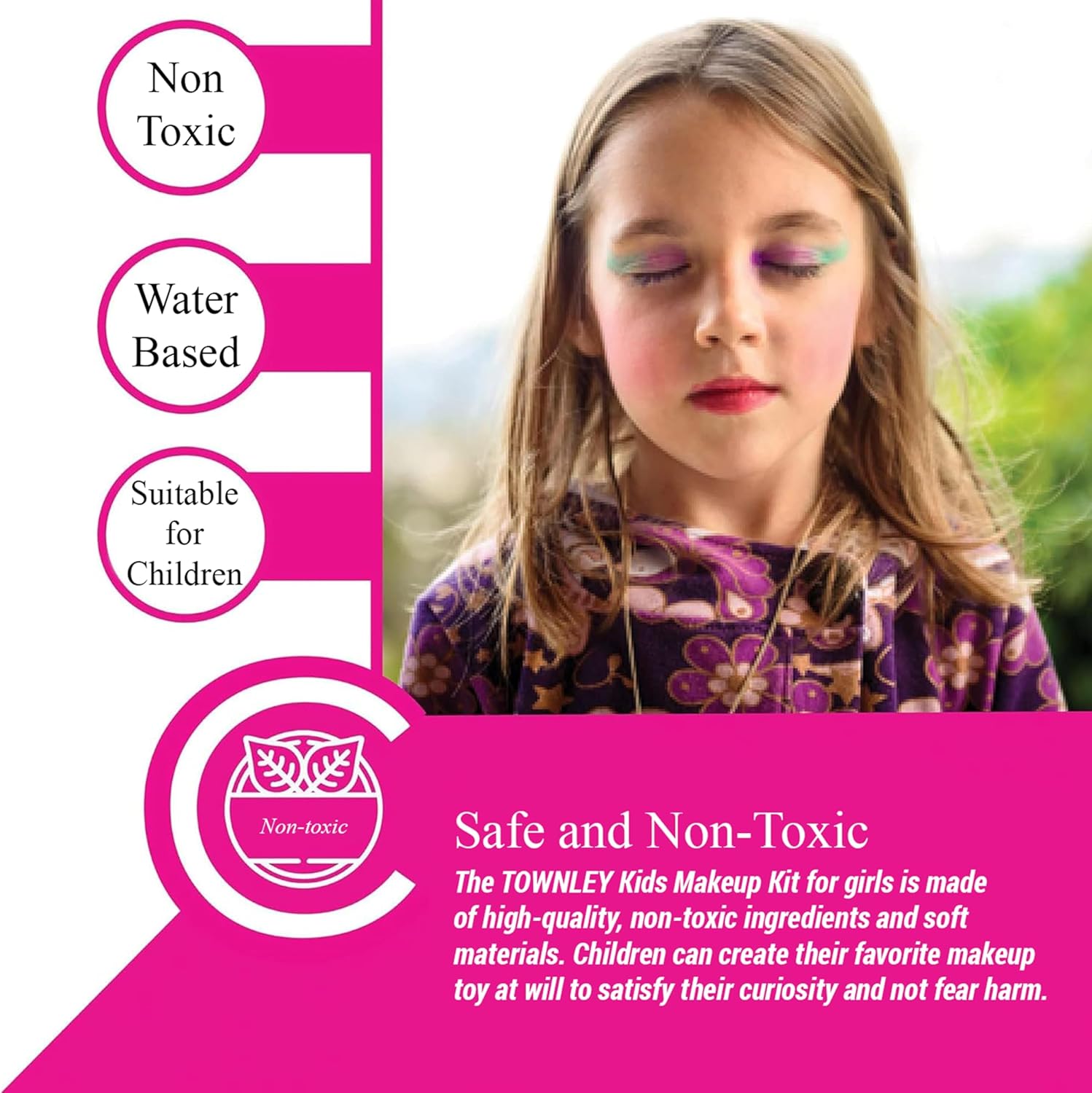 - Non-Toxic Makeup Set: TOWNLEY kids makeup kit for little girls is made of high-quality, toxic-free ingredients, and mild materials. Children can create their favorite makeup toy at will to satisfy their curiosity, and fear no harm.