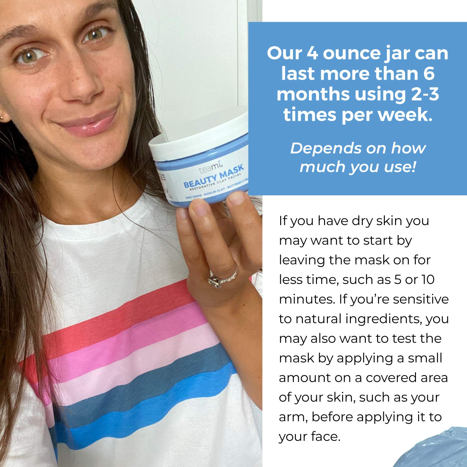 - πππ ππ πππ? π€ Apply the Teami face mask to slightly dampened skin, covering your entire face or use a spot treatment on specific areas. Allow mask to dry fully, usually 10-12 minutes. You can tell the detox mask is fully done doing its job when it has turned a lighter green color and is fully dry. Remove with warm water and pat dry with a towel. We suggest application 2-3 times per week or as needed for your skin type.