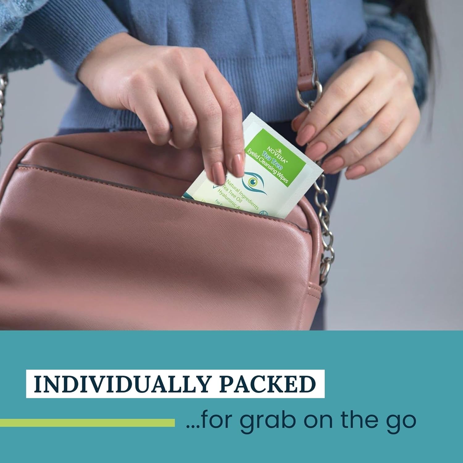 NOVEHA 60PCs Tea Tree Oil Eyelid & Lash Wipes | With Hyaluronic Acid, Green Tea & Chamomile For Blepharitis, Itchy & Stye Eyes, Individually Wrapped, Natural Eyelash Makeup Remover & Daily Cleanser