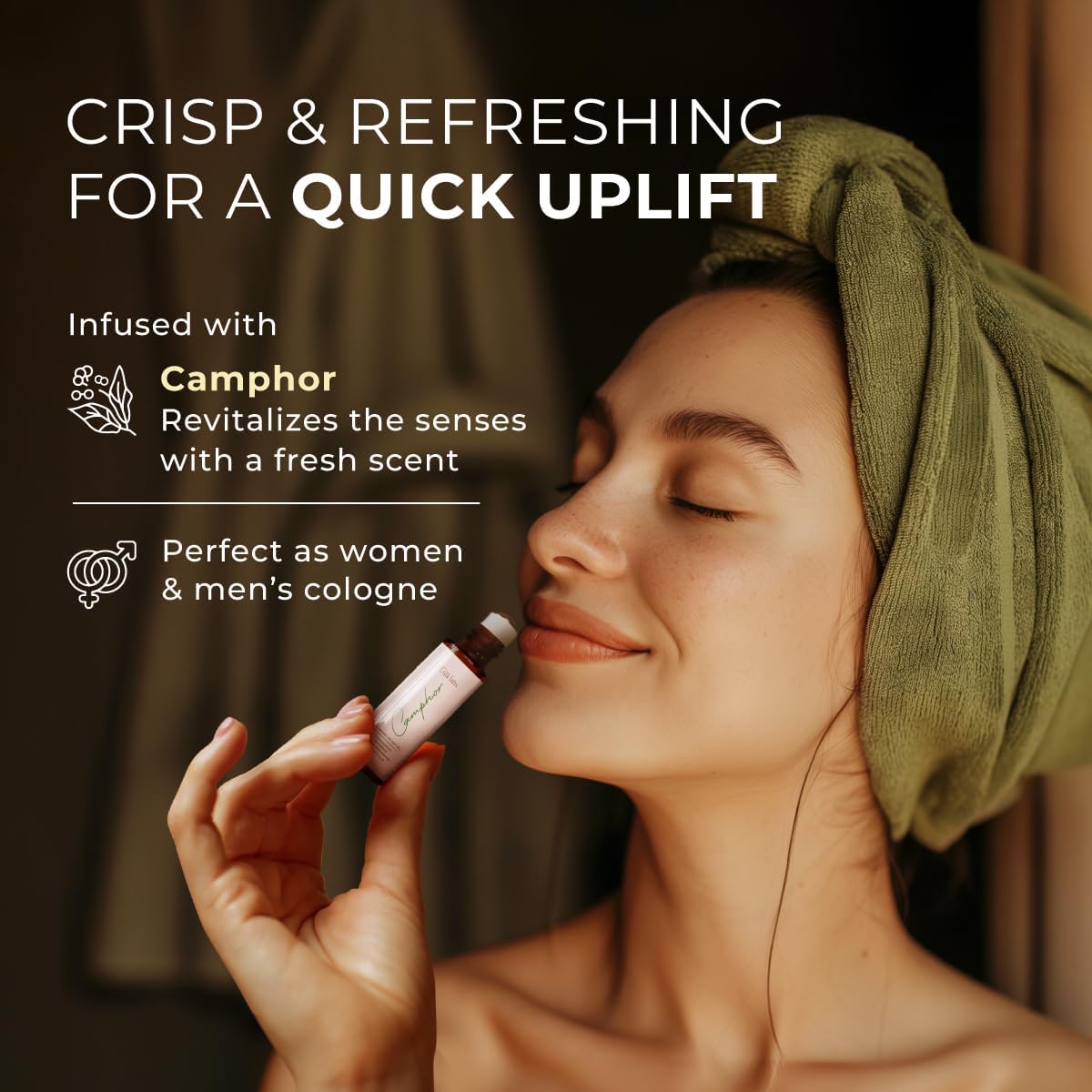 - Fast cooling & easing comfort: Elevate self-care with our 100% pure camphor essential oil roll-on. Enjoy its soothing, woody aroma and apply to your chest, nose and neck. Perfect in women & men's cologne, enjoy an aroma that appeals to both genders.