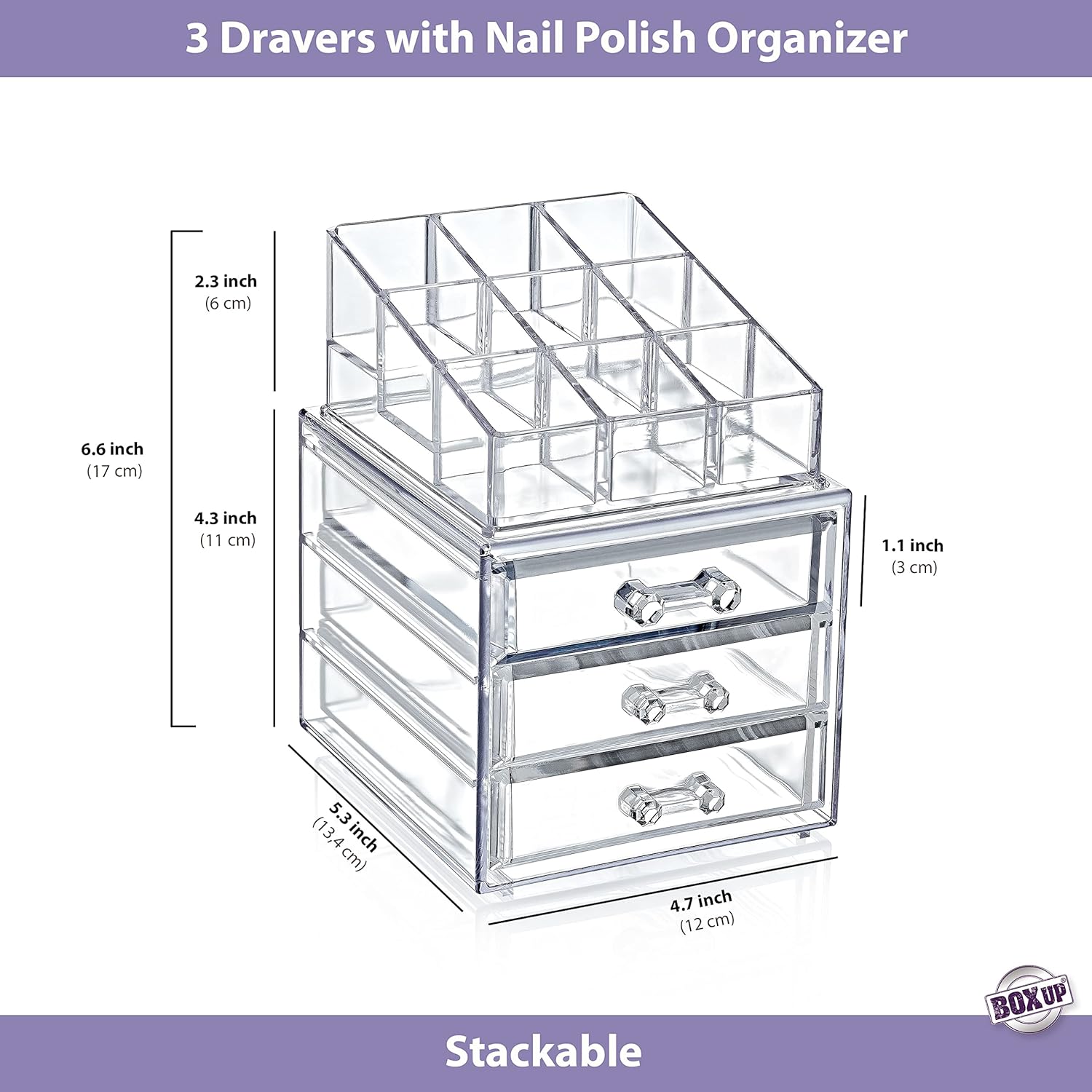 Boxup Makeup Organizer 3 Drawers,Makeup Organizers For Nail Polishers Clear Cosmetic Display Cases Stackable Storage Box With 3 Drawers For Vanity