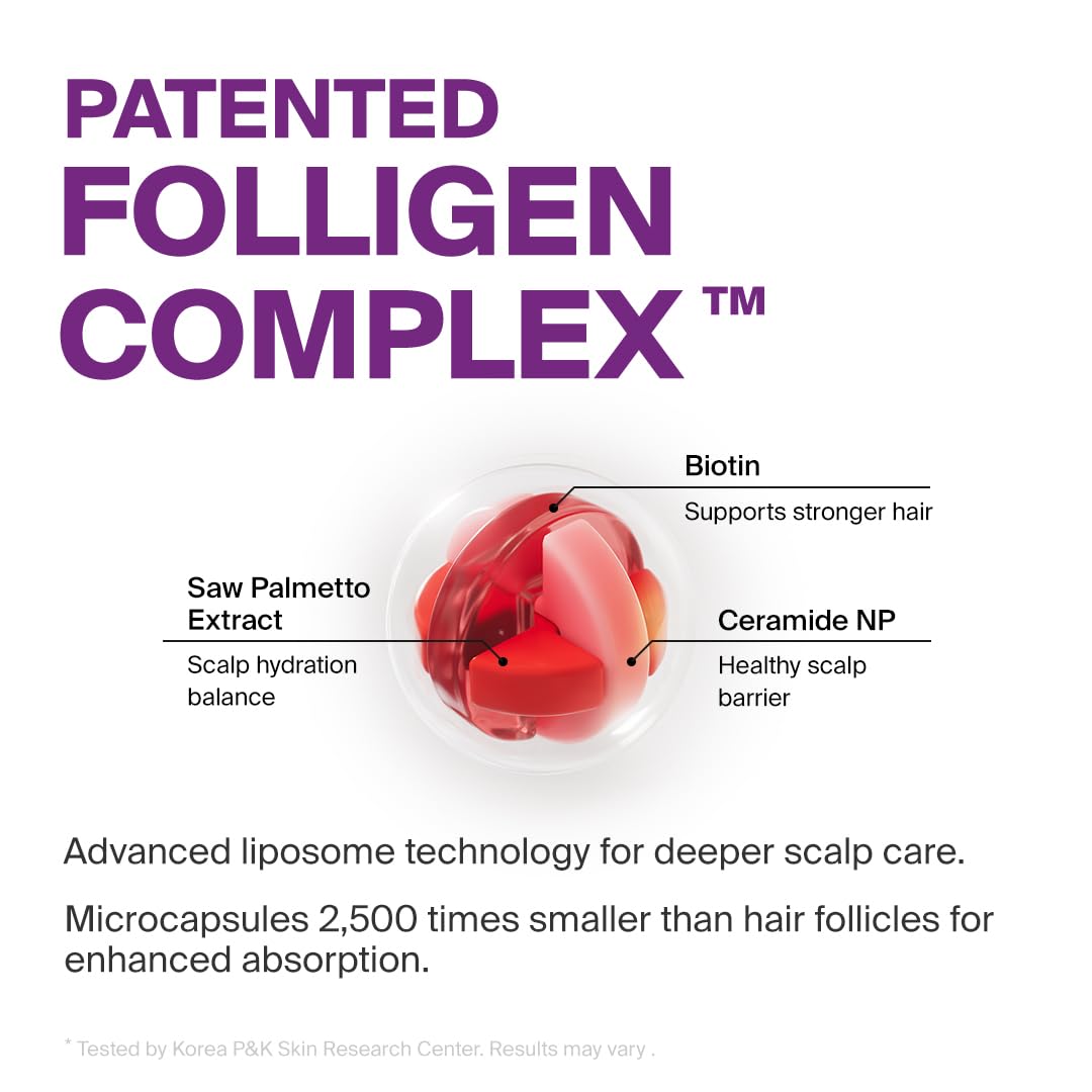 - Folligen Complex for Scalp Care and Hair Strengthening: Our patented Folligen Complex strengthens the scalp, improves its elasticity, and makes hair thicker and fuller. With a size 2,5000 times smaller than pores, active ingredients absorption is ensured for maximum efficiency