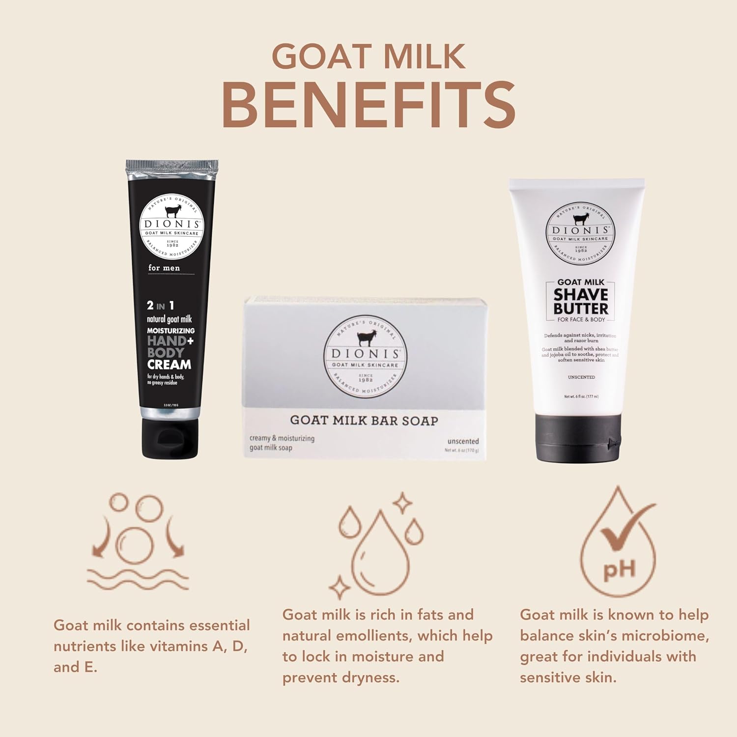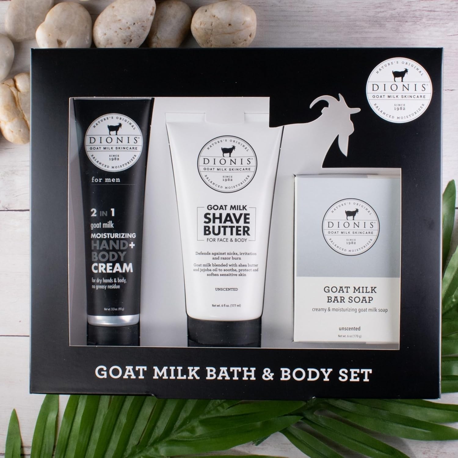 Dionis Goat Milk Skincare Men's Unscented Bath & Body 3pc Gift Set - Blended Shea Butter & Jojoba Oil Shave Butter For Sensitive Skin, Unscented Hydrating Moisturizer & Nourishing Bar Soap For Men