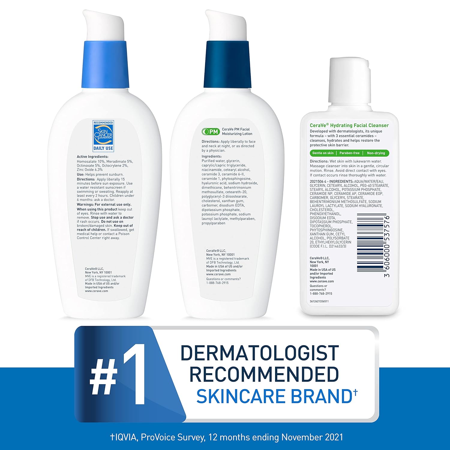 CeraVe AM Face Moisturizer with SPF, PM Face Moisturizer & Hydrating Face Wash Skin Care Routine for Morning & Night | Travel Size Toiletries | 3oz Lotion + 3oz Lotion + 3oz Cleanser