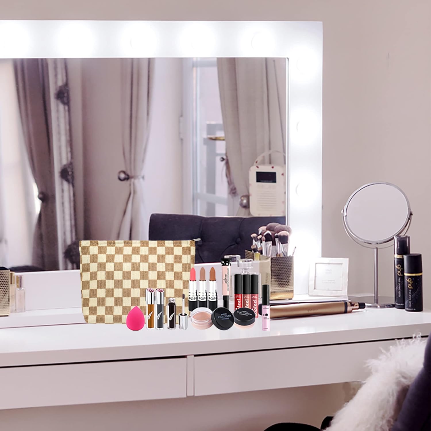 PAZIMIIK Makeup Bag Large Zipper Corduroy Make Up Pouch for Purse Travel Canvas Cosmetic Organizer for Women Brush Storage,Checkered Light Brown