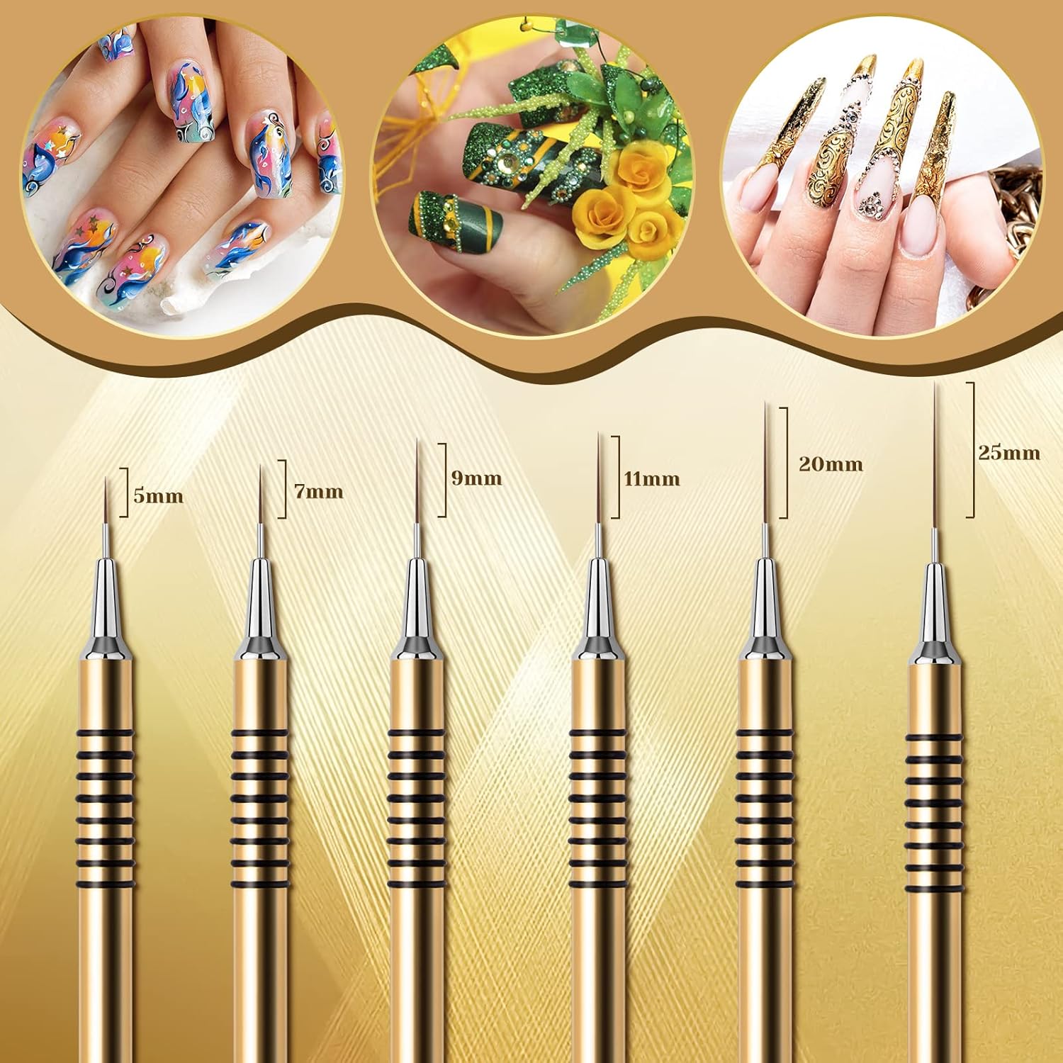 - [6pcs Nail Art Brush Set] Nail liner brush set contains 6 different size nail brushes(5/7/9/11/20/25mm). Super thin nail art brushes can achieve the tiny details and fine lines of nail designs, which are perfect for professional nail salon or home DIY! Buy best gift for girls who love manicure on Birthday, Christmas, Thanksgiving and Halloween