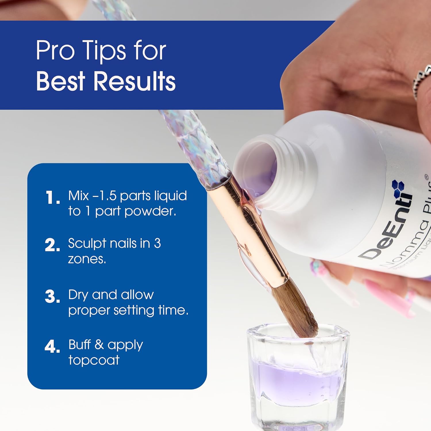 - FLEXIBLE AND COMPATIBLE, combine with DeEnti acrylic powders for superior adhesion. Acrylic liquid is also compatible with all acrylic powders from other brands.