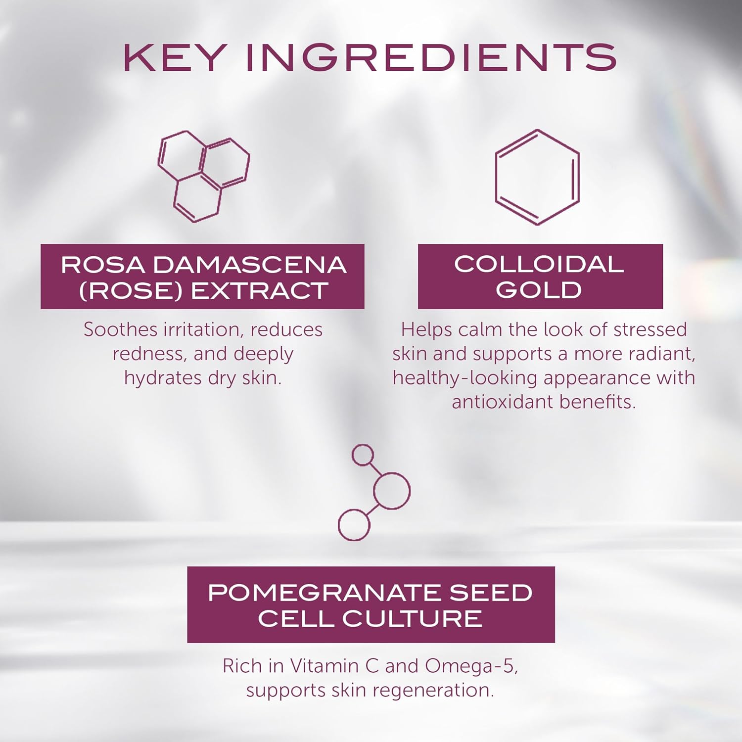 - Rose Gold: Rose is a botanical extract high in antioxidants which helps to protect the skin against external aggressors. Gold extract reveals a glowing, even skin tone and improves circulation.