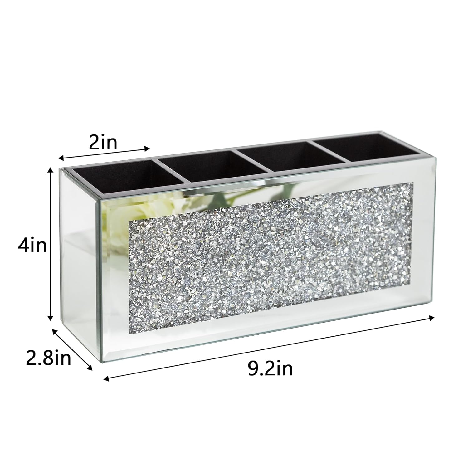 - MATERIAL - Makeup brush holder is made of HD mirror glass and MDF, inlaid with stunning bling crystal crushed diamonds on the front, suitable for any decoration.