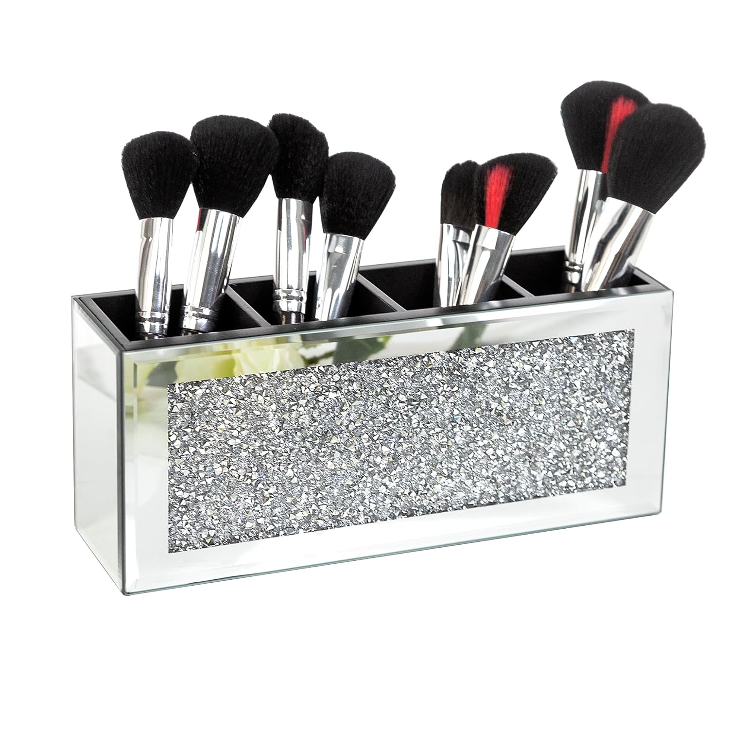 SHYFOY 4-Compartment Makeup Brush Holder, Mirrored Makeup Organizer with Crushed Diamond Crystals, Vanity Cosmetics Organizer Solution, Pencil Holder Organizer for Desk