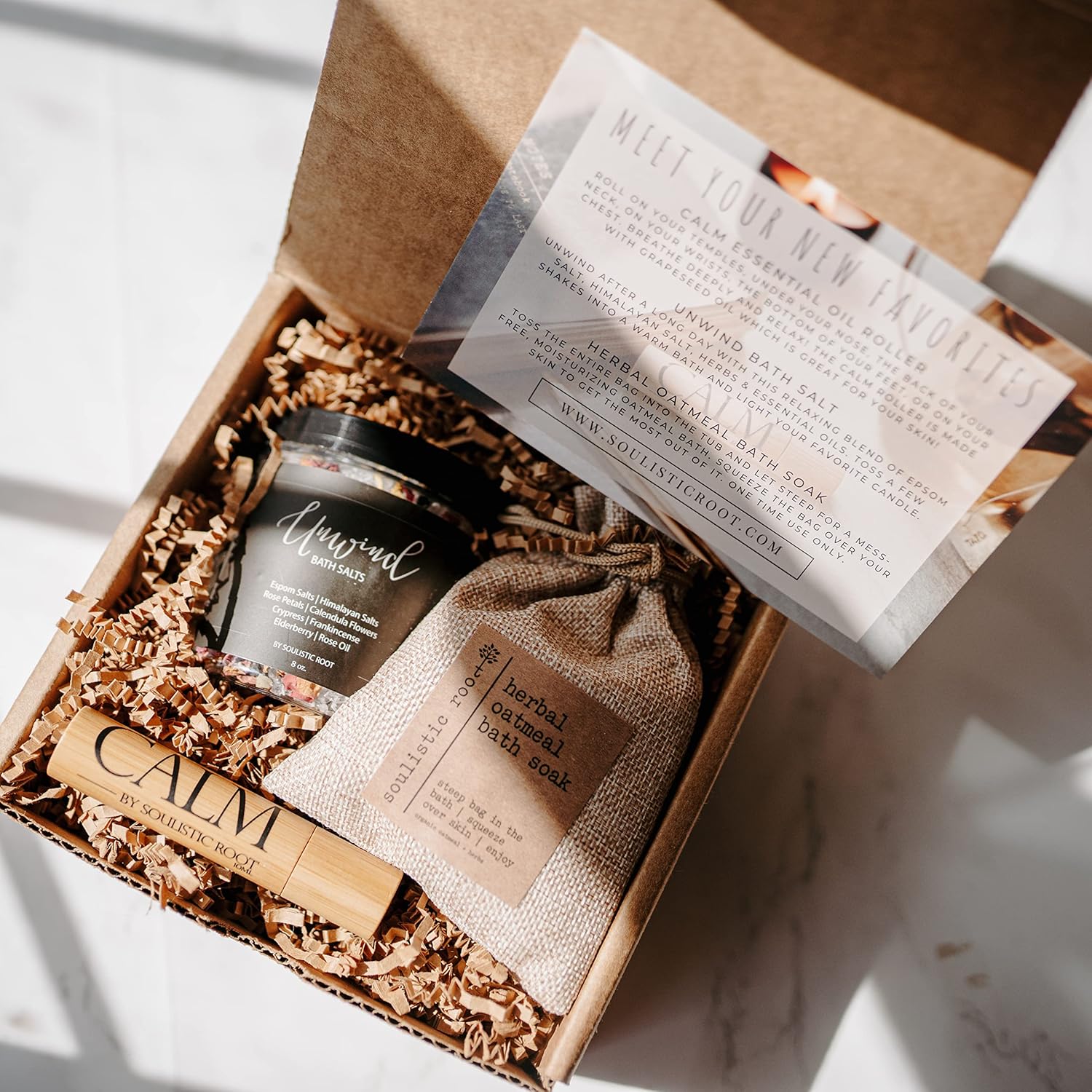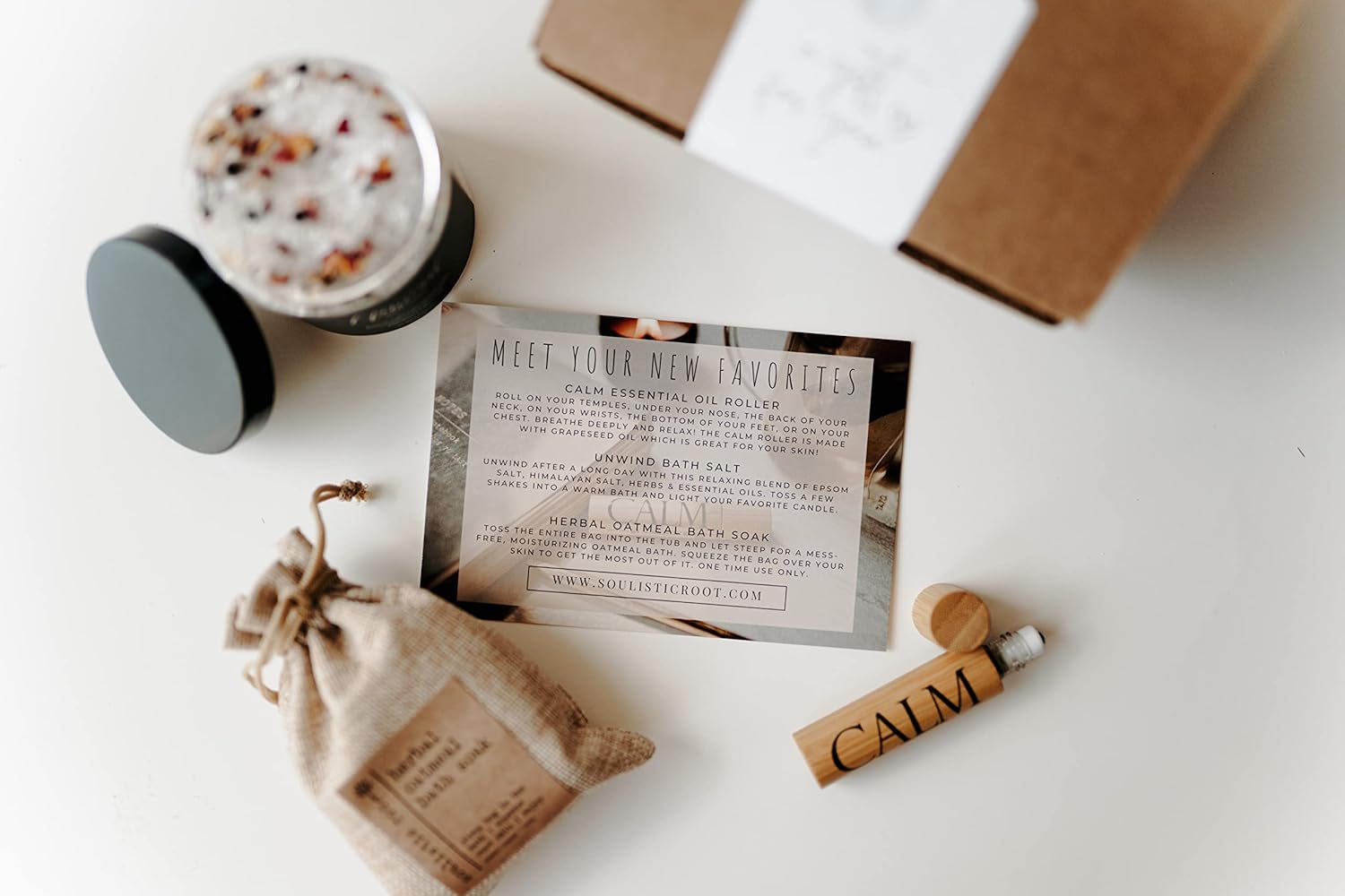 - Full Ingredient List: Calm Roller - Grapeseed Oil, Lavender, Clary Sage, Chamomile, and Bergamot Essential Oil. Unwind Bath Salt - Epsom Salt, Himilayan Salt, Rose, Cypress, Frankincense Essential Oil, and Dried Herbs. Herbal Soak - Organic Oat Flour, Rose Petals, and Chamomile Flowers. Our essential oil blends are prepared, packaged and shipped in the USA using ethically sourced ingredients. Soulistic Root is a small, women owned business located in Colorado.