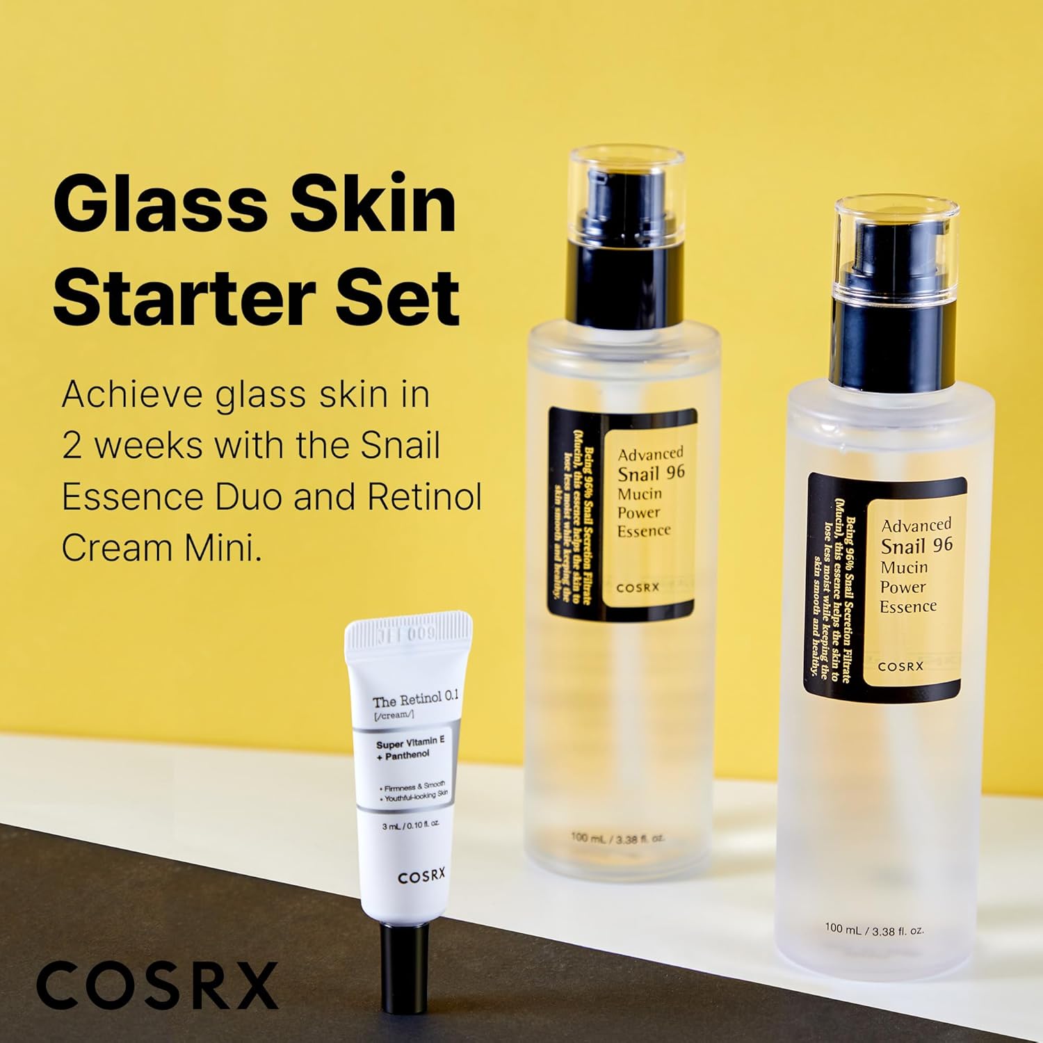 - Glass Skin Regimen: The perfect regime for dewy glass skin, with 2 pcs of the best selling COSRX Snail 96 Power Mucin Essence and 1 mini sized The Retinol 0.1 Cream. Achieve glowing and firmed, plumped up skin in just 2 weeks with this all-in-one set.