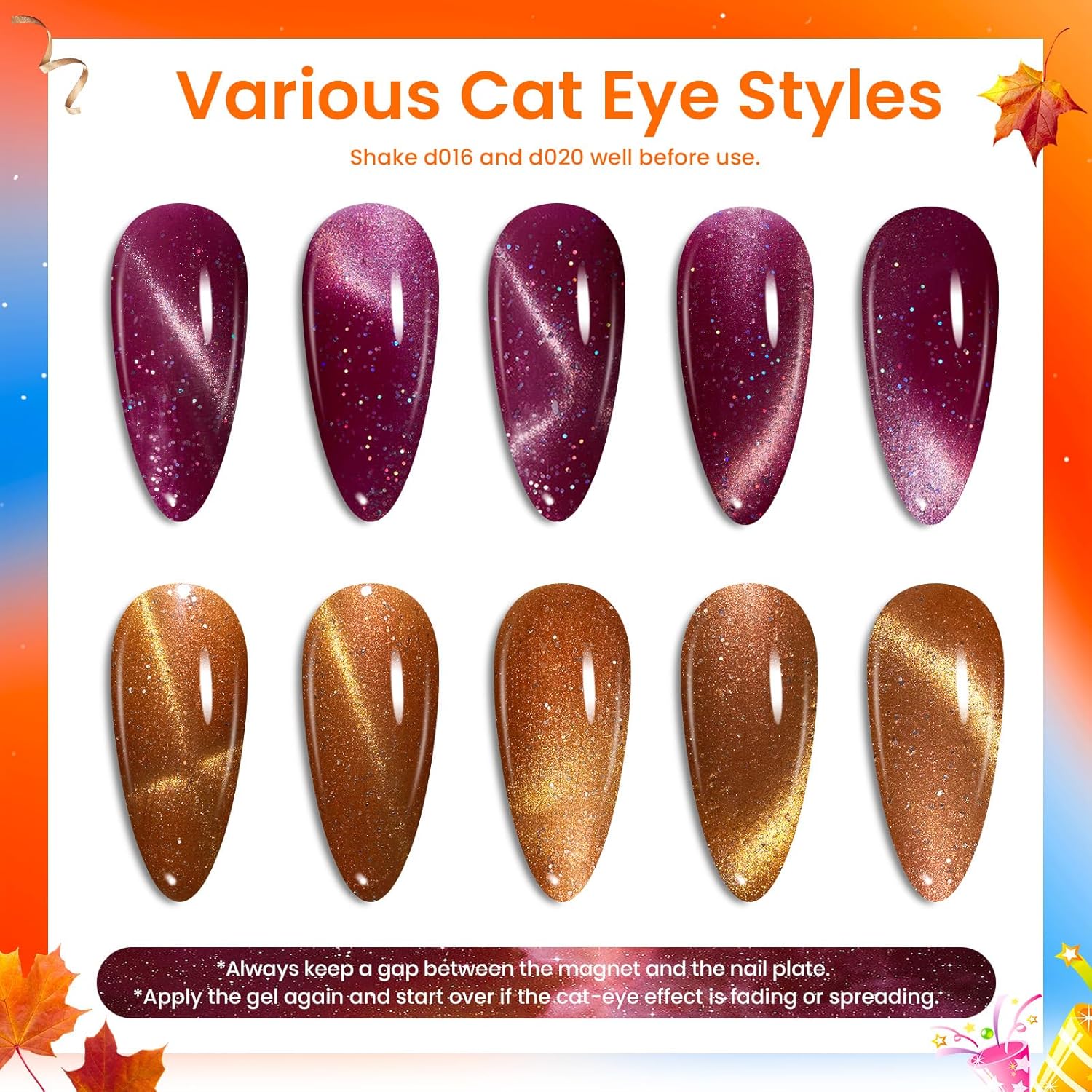 - 【Amazing Magnet Effects】 Your perfect Gift Choice. The fun of cat eye nails lies in how customizable they can be. All you need is a tiny magnet, which is included in the set as a gift. There are so many effects that can be created with this Autumn set. Easy and fast, yet still maintaining the professionalism of the product, keeping up with the current fashion. Go enjoy the wonderful music festival with your eye-catching nails!