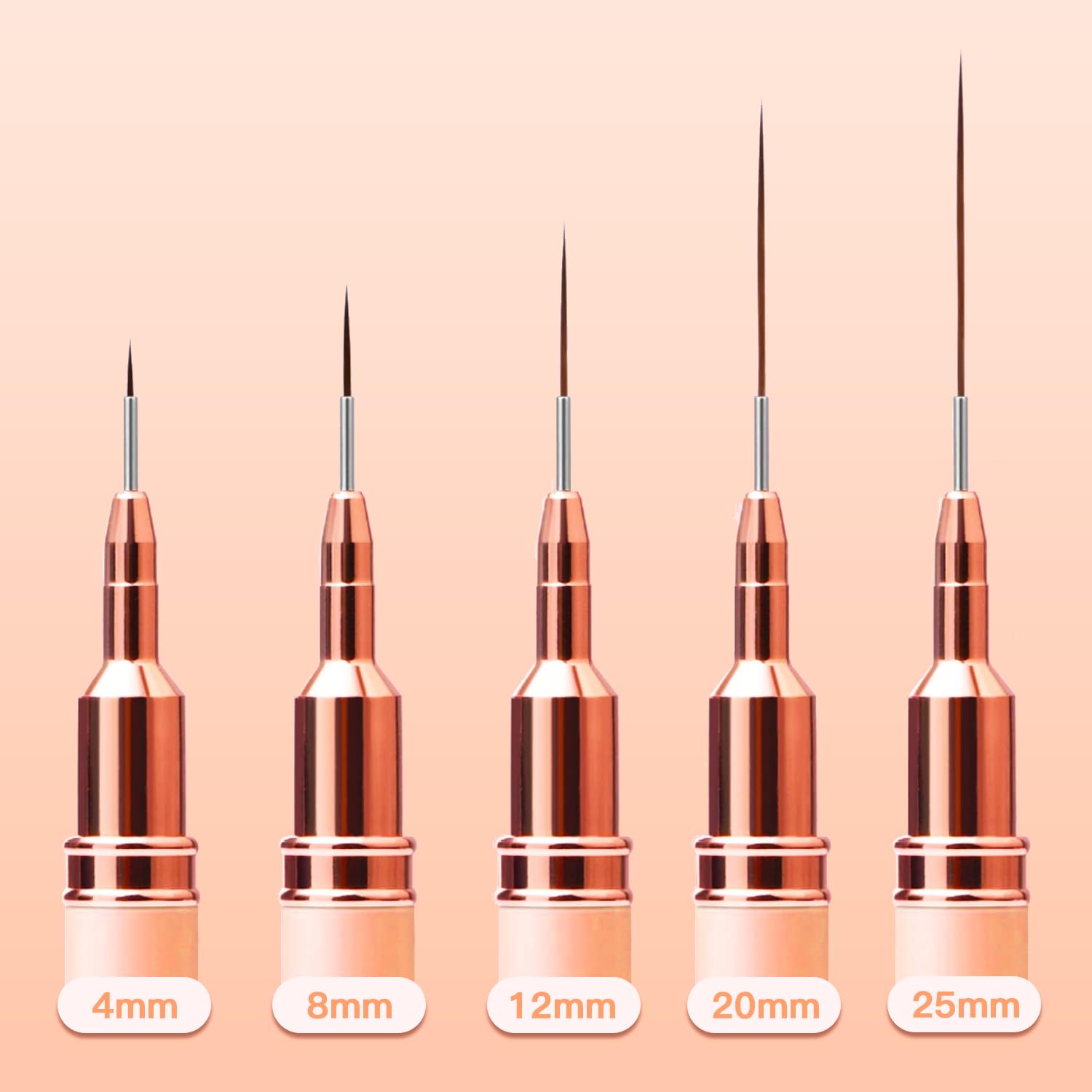 Metallic Nail Art Brushes, 5Pcs Liner Brush Set, UV Gel Polish Painting Art Design Pen for Long Lines, Thin Details, Fine Drawing Sizes 4/8/12/20/25mm(Champagne Gold)
