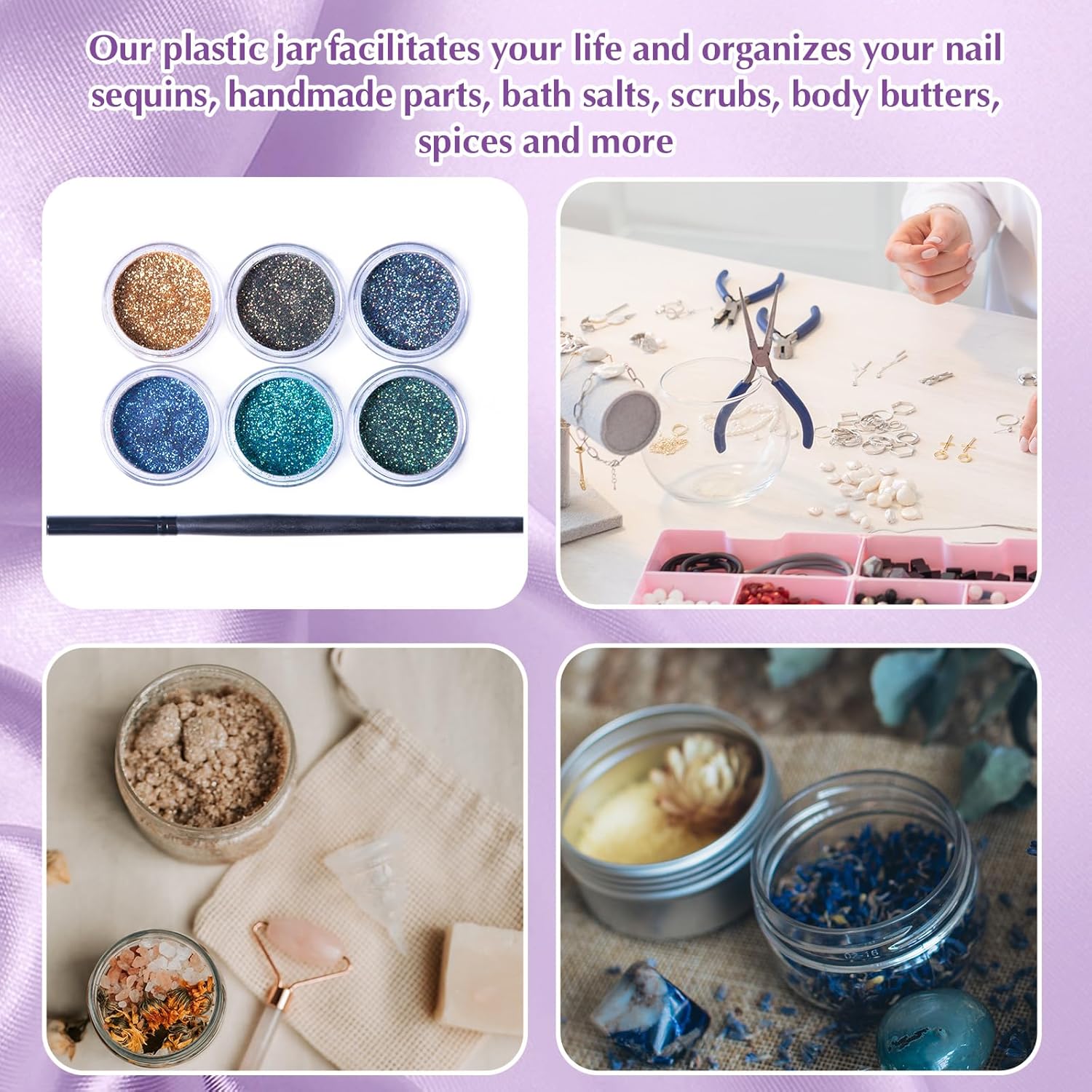 - Multifunctional Containers: you can use these plastic jar containers with lids to store your personal beauty products for travel, ideal to dispense; You can also use it to store homemade sugar scrub cream, body lotions, bath butter soap gifts, body butters and hair moisturizers, small and easily lost jewelry, small crafts like beads, seasonings, acrylic paints, flower seeds, rhinestones etc., which will keep your things organized and make your life more convenient