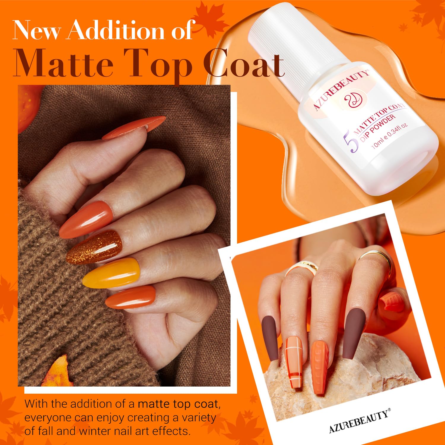 - 8-Color Upgraded Starter Kit: AZUREBEAUTY 30 Pcs fall theme dip nails powder starter kit: 8*10 g (0.33 Oz) color powder, 4*10 ml dip powder liquid set(base coat/activator/top coat/matte top coat), 2*liquid brush replacement, 1*nail brush,1*nail file, 1*nail buffer, 1*dip powder recycling tray. What's more, 10*nail sticks and 2*orangewood stickers are added in the kit for color testing as well as ease of use