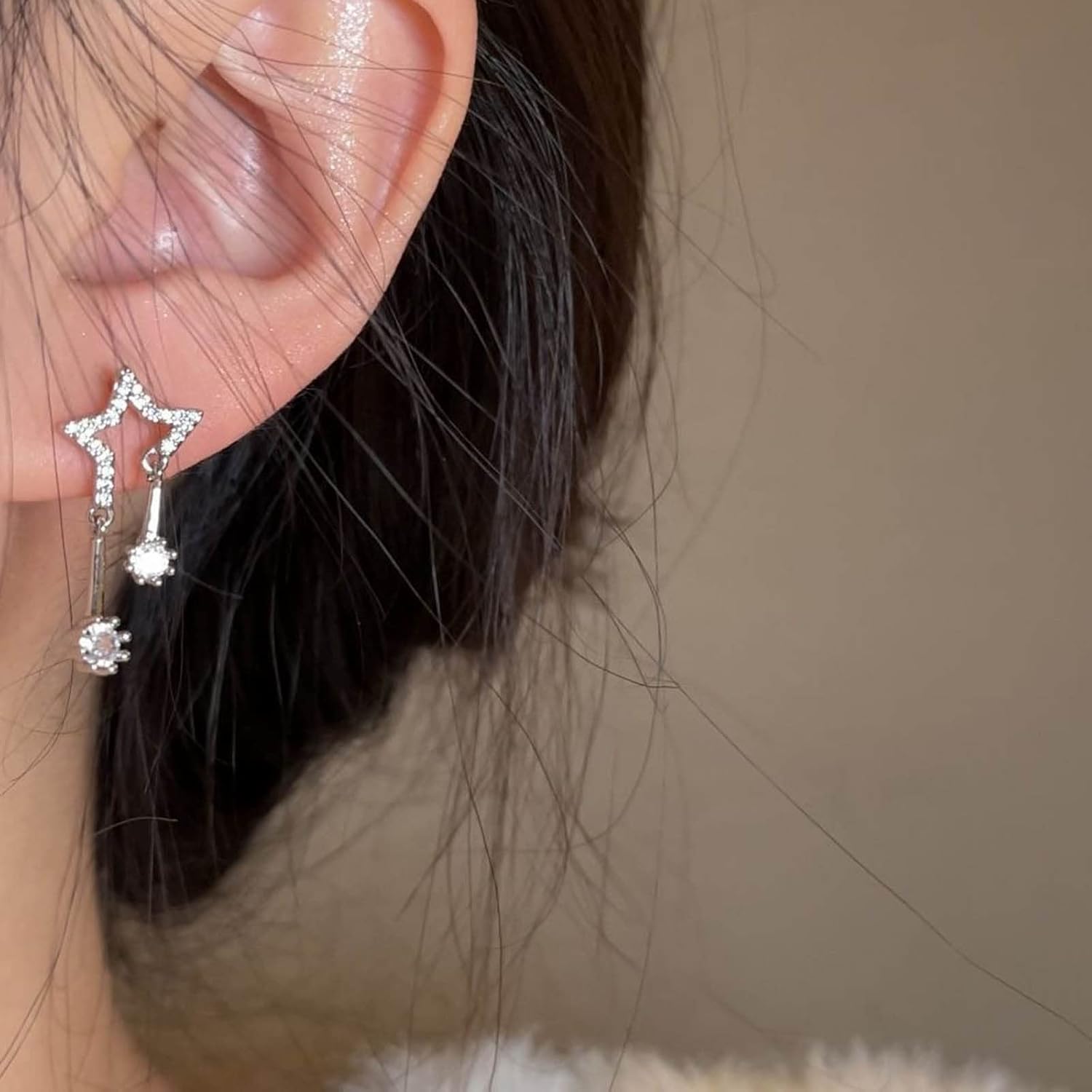 - Rhinestone star drop earrings.Item Details:Handmade Item.Size:As Shown.Color:Silver.Materials:Quality Alloy/Crystal.Location:Ear.Style:Boho/Vintage.