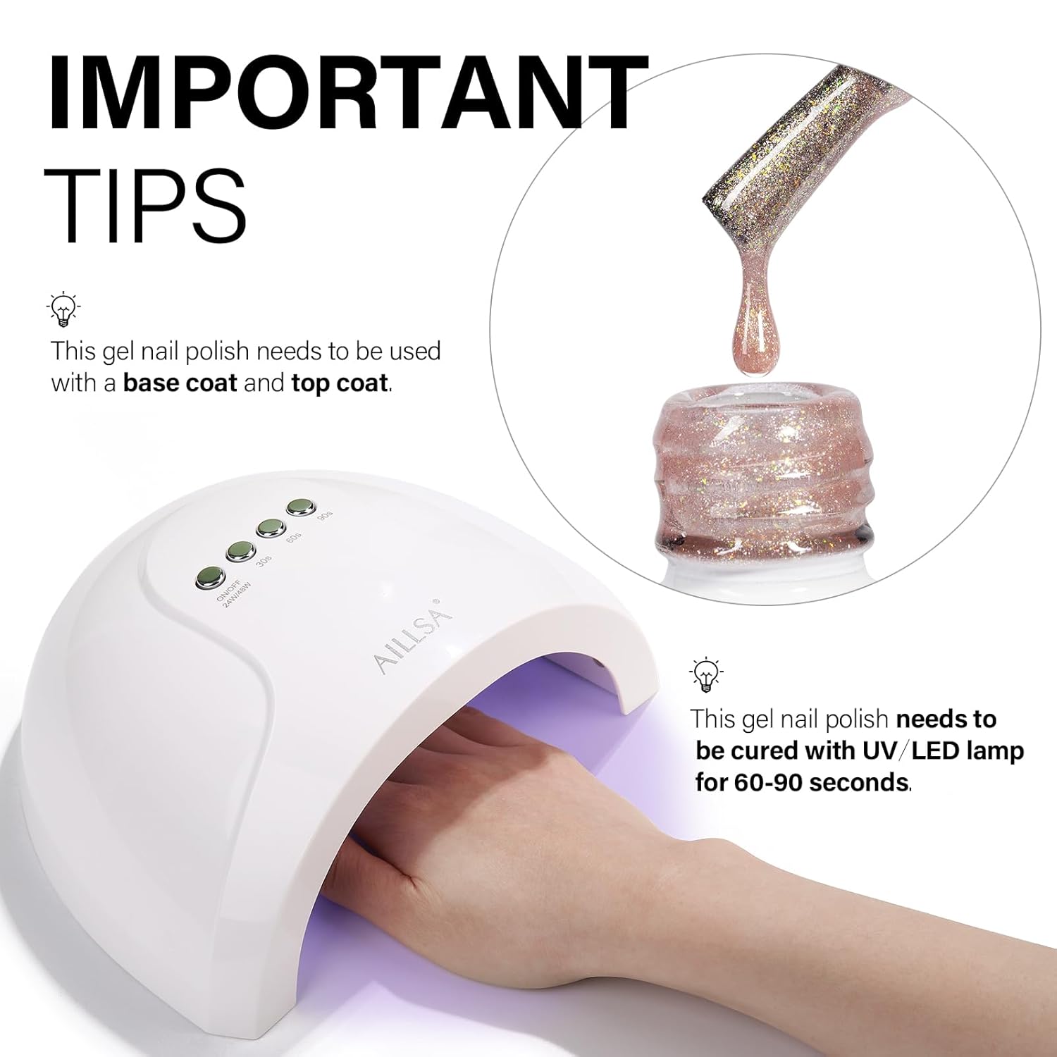 - LONG-LASTING SHINE - AILLSA champagne gold gel nail polish needs to be cured under U V lamp, under the correct use steps, it can last for 21-28 days and keep the shiny luster. You'll never have to worry about your nails peeling off while showering and doing housework. Let AILLSA serve you a longer time!
