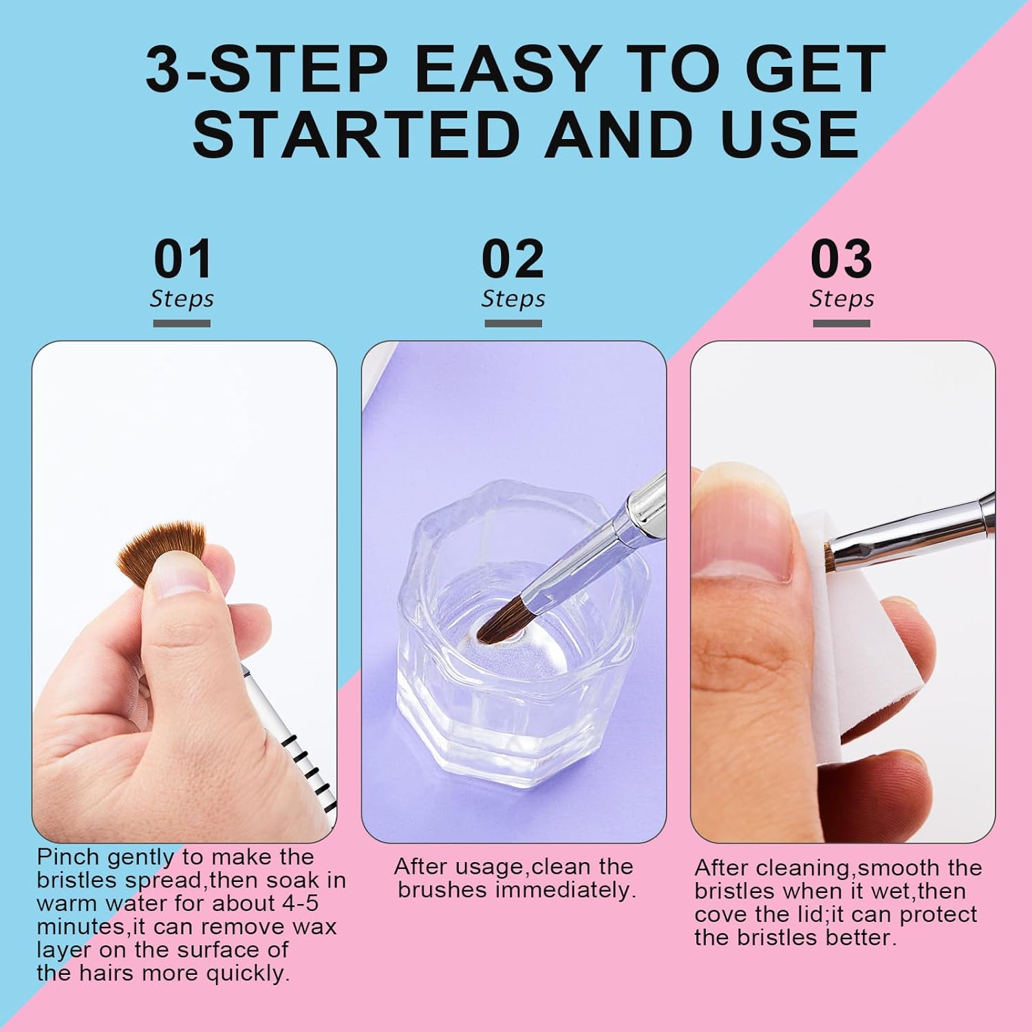- 🧚♀【Warm Tips】: Soak the acrylic nail brush in hot water (above 176 °F) for a minute to wash off the sealing wax on the surface in the first use. To lengthen the lifetime of these acrylic brushes, please clean the nail brush immediately after each use to prevent hardening. Wait it dry, cap the cap on to protect the nail brush bristles.