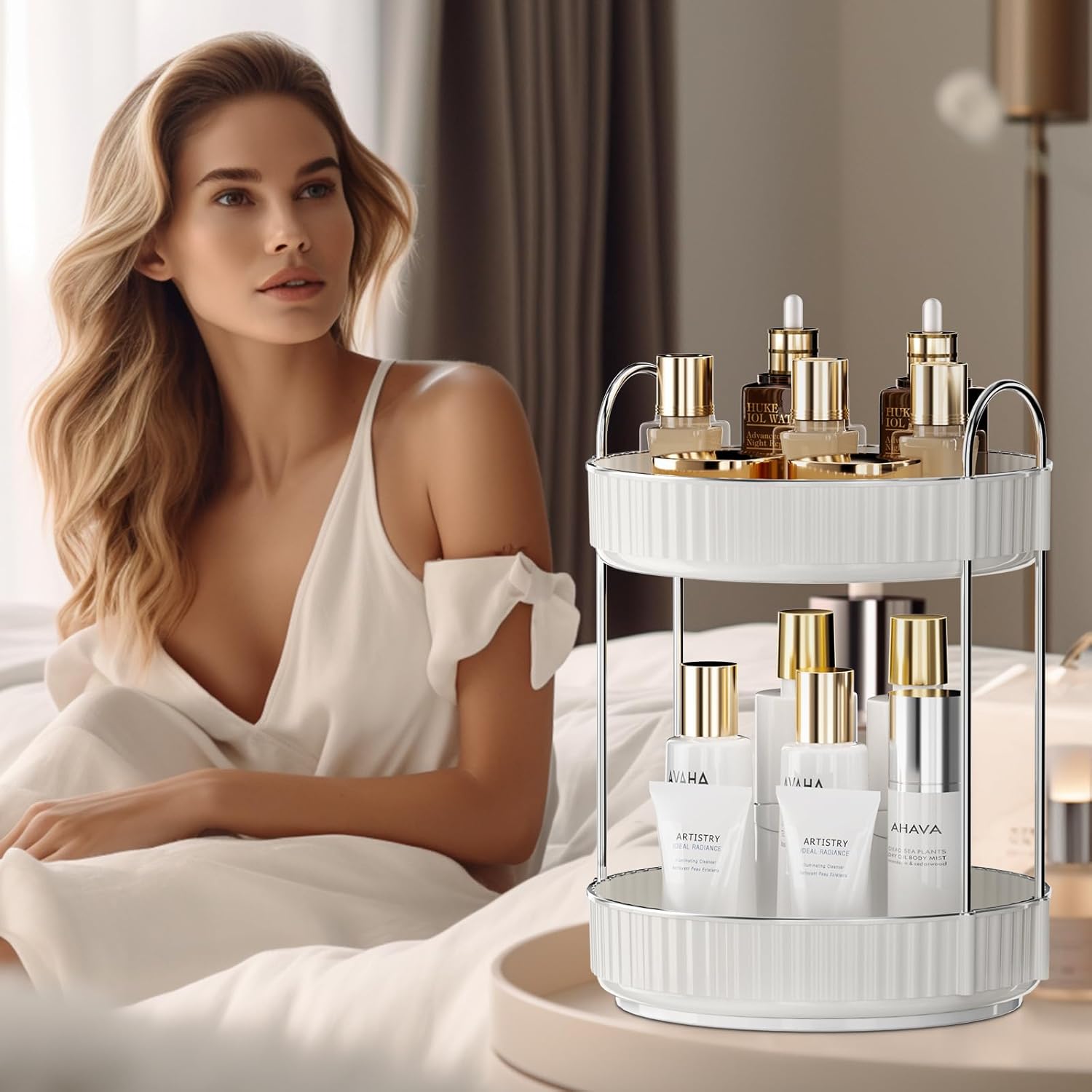 Rotating Makeup Organizer for Vanity, 2 Tier High-Capacity Skincare & Makeup Storage, Perfume Organizer, Cosmetic Dresser, Countertop 360 Spinning
