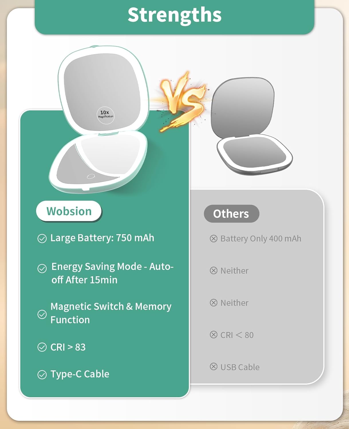 WOBSION Rechargeable Lighted Travel Makeup Mirror,1x/10x Compact Magnifying Mirror with Lights,Portable for Bag,4inch,Gift,Cyan