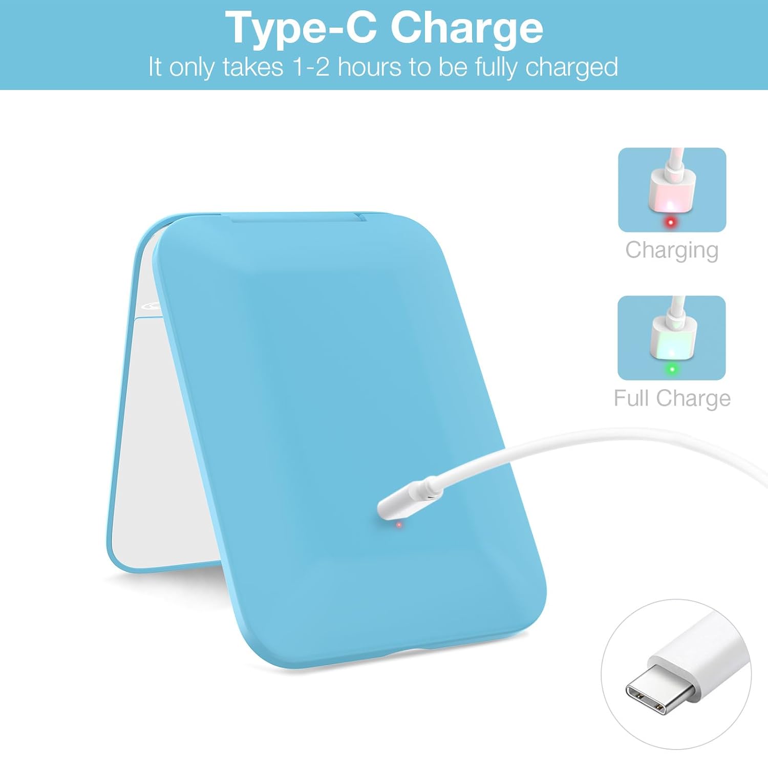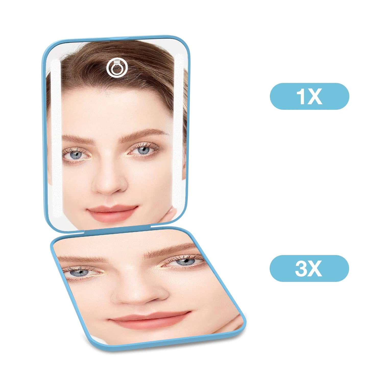 Kintion Rechargeable Pocket Mirror, Double Sided 1X/3X Magnification Compact Vanity Mirror, 3 Color Lights, Dimmable, Small Portable Wallet Mirror, Lighted Travel Mirror for Women Gifts, Blue