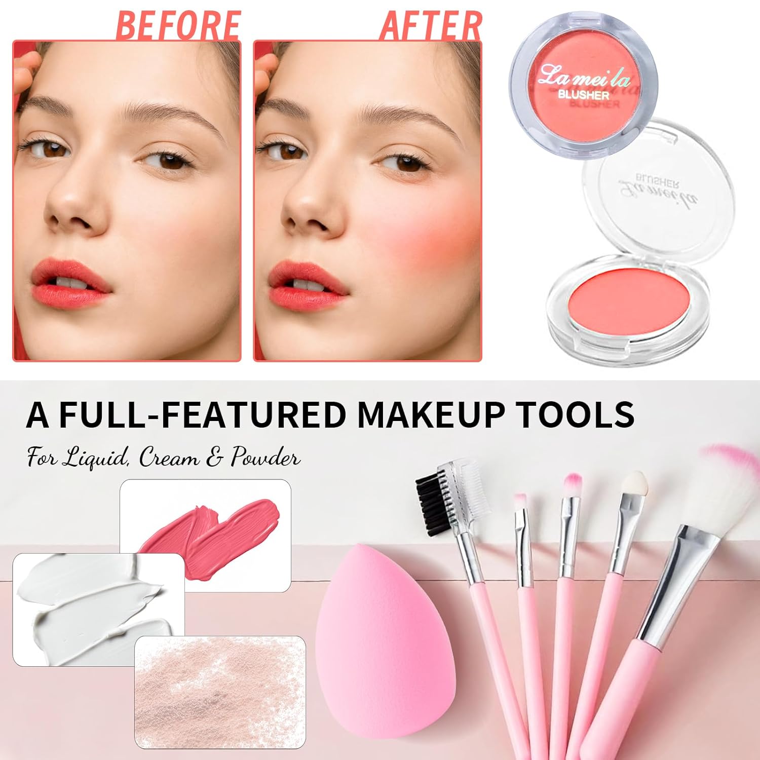 - [Makeup Present Set] The perfect starters’ makeup kit includes 9 colors eyeshadow palette, face blusher, full coverage liquid foundation, dual-ended eyebrow pencil, winged eyeliner stamp, lip gloss, lip oil, 5pcs makeup brushes set, makeup sponge. All women’s makeup essentials are put in one gorgeous cosmetic bag.