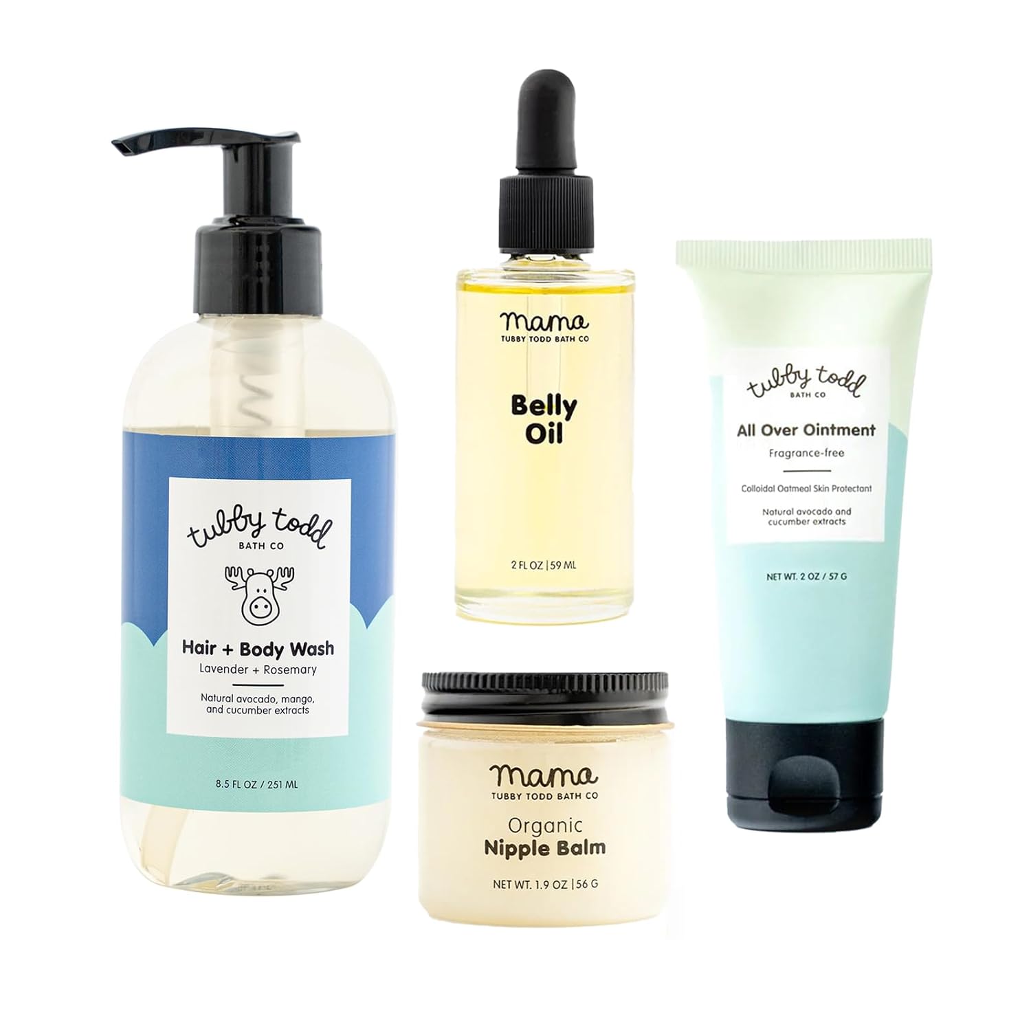 - Includes 4 products: 8.5oz Lavender Rosemary Hair + Body Wash, 2oz Fragrance-Free All Over Ointment, 2oz Belly Oil, 1.9oz Organic Nipple Balm plus Gift Box