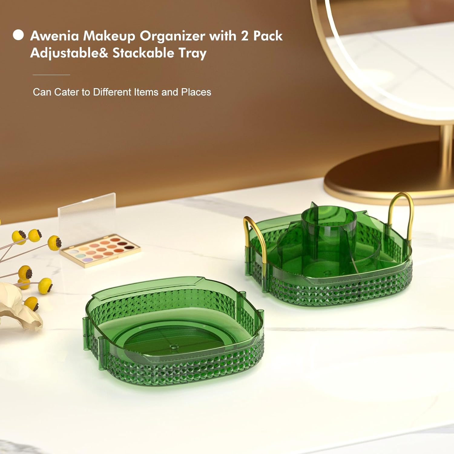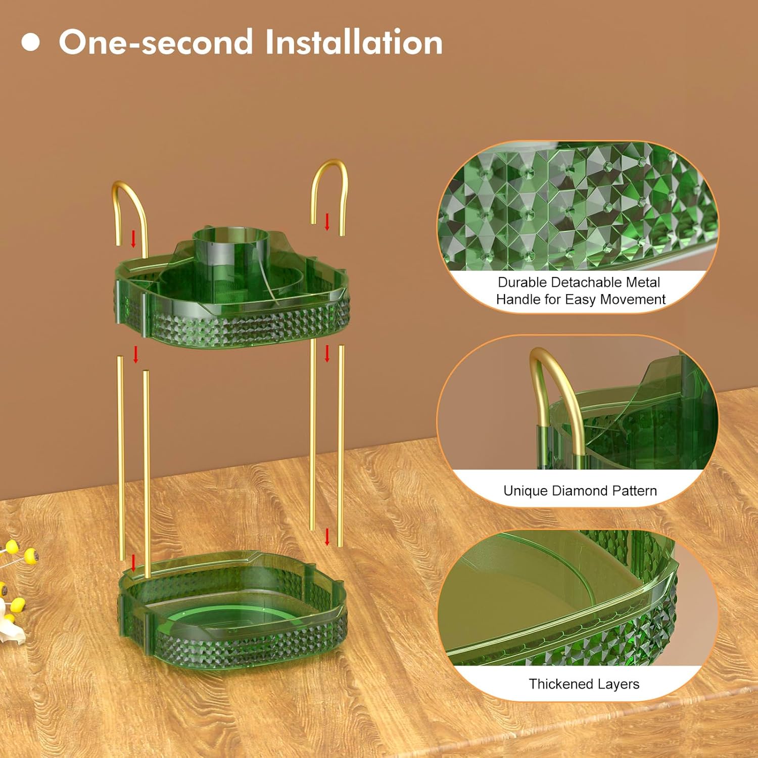 Awenia Rotating Makeup Organizer 360, Stackable Adjustable Large Capacity Cosmetic Storage Unit,Dresser Bathroom Kitchen Countertop Organizer with Metal Handle, Plus Size (Gem Green, 2 Tier)