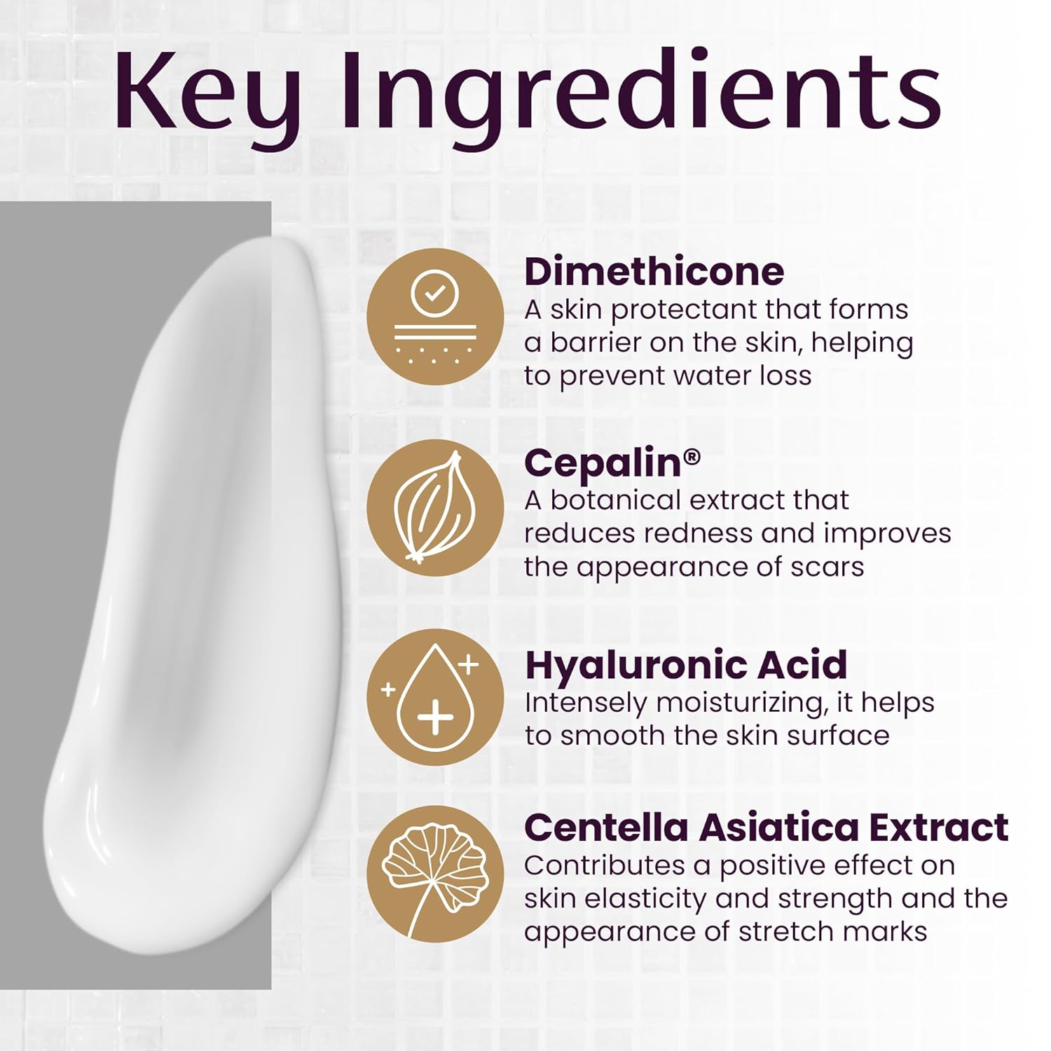 - Product 1: INTENSIVE CREAM FORMULA: With Cepalin botanical extract, Hyaluronic Acid and Centella asiatica extract to moisturize, nourish the skin and visibly reduce stretch marks
