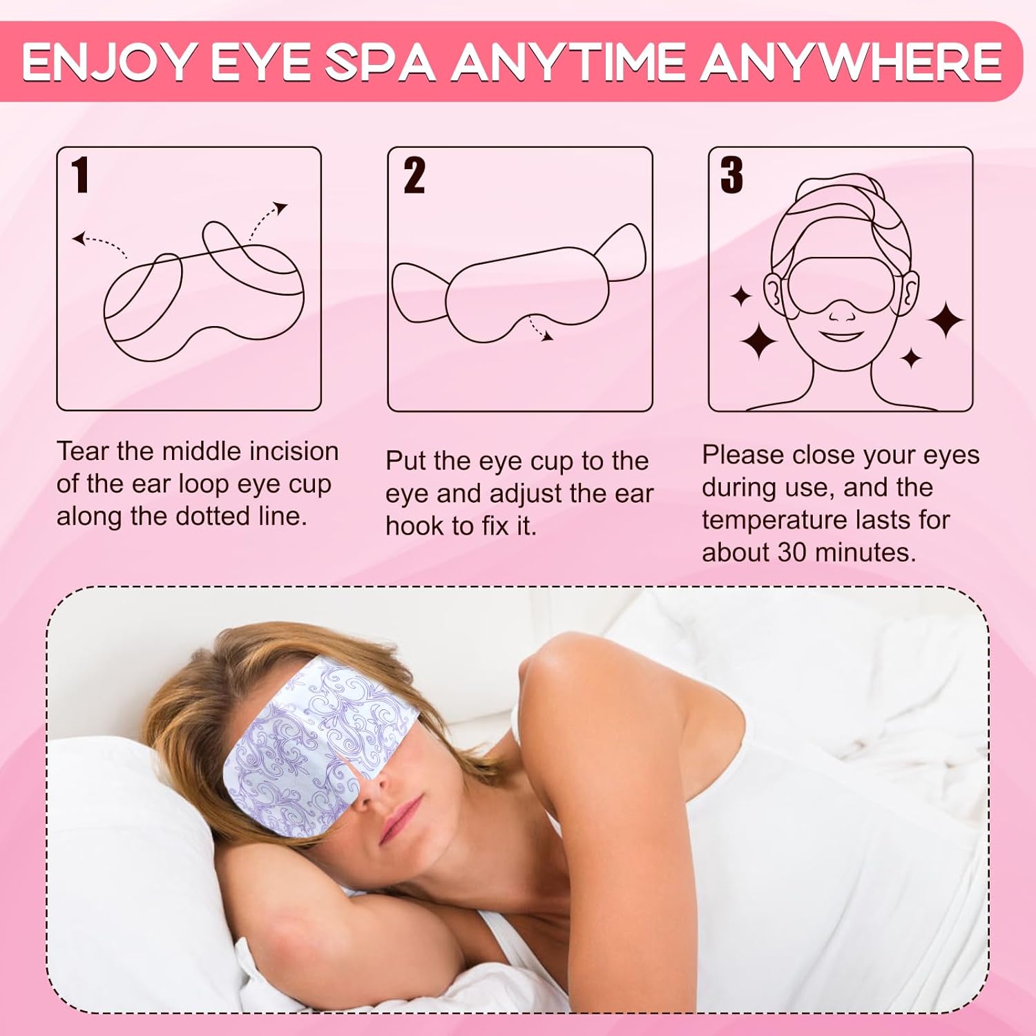 - 【Warm and relaxed】The temperature of disposable steam goggles is only 104 ℉ to 113℉, it is only slightly higher than the temperature of the human body. The hot steam eye mask can maintain warmth for about 20-30 minutes. This temperature can help you relax and fall asleep easily. Even when you're sleeping, enjoy the moist heat of an eye massage.