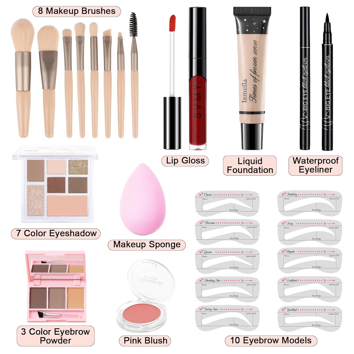 - 【Makeup Full Kit】 The multipurpose makeup set contains 1 7-color eyeshadow palette, 1 matte velvet blush, 1 lip gloss, 1 3-color eyebrow powder, 1 waterproof eyeliner, 1 full coverage foundation, 10 eyebrow models, 8 makeup brushes and 1 makeup sponge. This comprehensive set covers the majority of your daily facial makeup essentials.