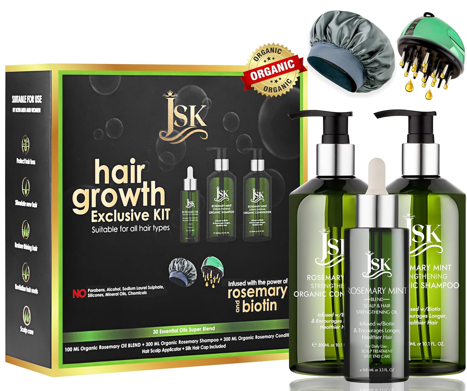 JSK Hair Growth Shampoo & Conditioner Set Biotin & Rosemary for Thinning Hair, DHT Blockers, Hair Care Kit for Men & Women, Includes Scalp Massager & Bonnet, Sulphate-Free Thickening & Moisturizing
