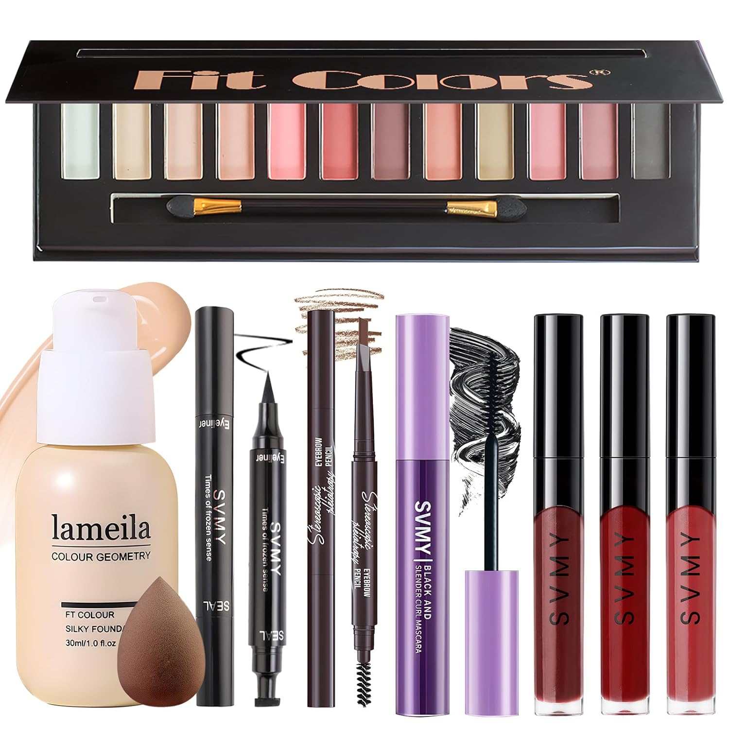 - 【Makeup Kit for Women Full Kit】This makeup kit for women includes 1 12-color natural matte eyeshadow palette, 1 natural foundation, 1 waterproof mascara, 1 double-ended eyebrow pencil, 1 eyeliner stamp, 3 lip gloss and 1 makeup sponge. This comprehensive set covers the majority of your daily facial makeup essentials.