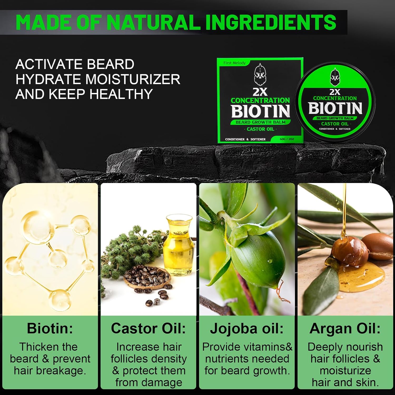 - 【MAXIMUM CONCENTRATION BIOTIN BEARD BALM】 Our beard balm is specifically formulated to promote beard growth and soften your beard. Biotin, one of the key ingredients, helps strengthen hair follicles, promoting healthy beard growth. As a topical application, biotin nourishes your hair follicles and prevents shedding while revitalizing and improving the appearance of your weak and damaged hair