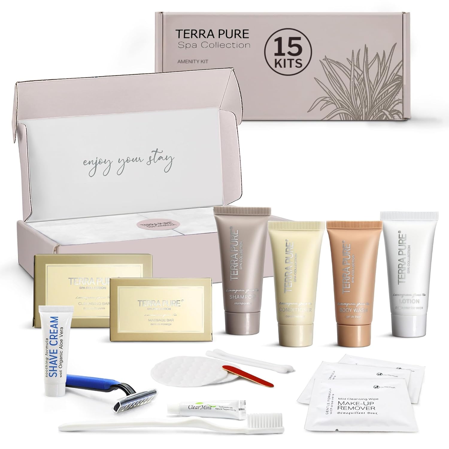 Terra Pure Spa Collection Amenity & Accessory Kit |1 oz Travel Size Shampoo, Conditioner, Lotion, Body Wash, 2 Soap Bars, Shave & Dental Sets, Make-Up Remover Wipes, & Vanity Kit | 15 sets/case