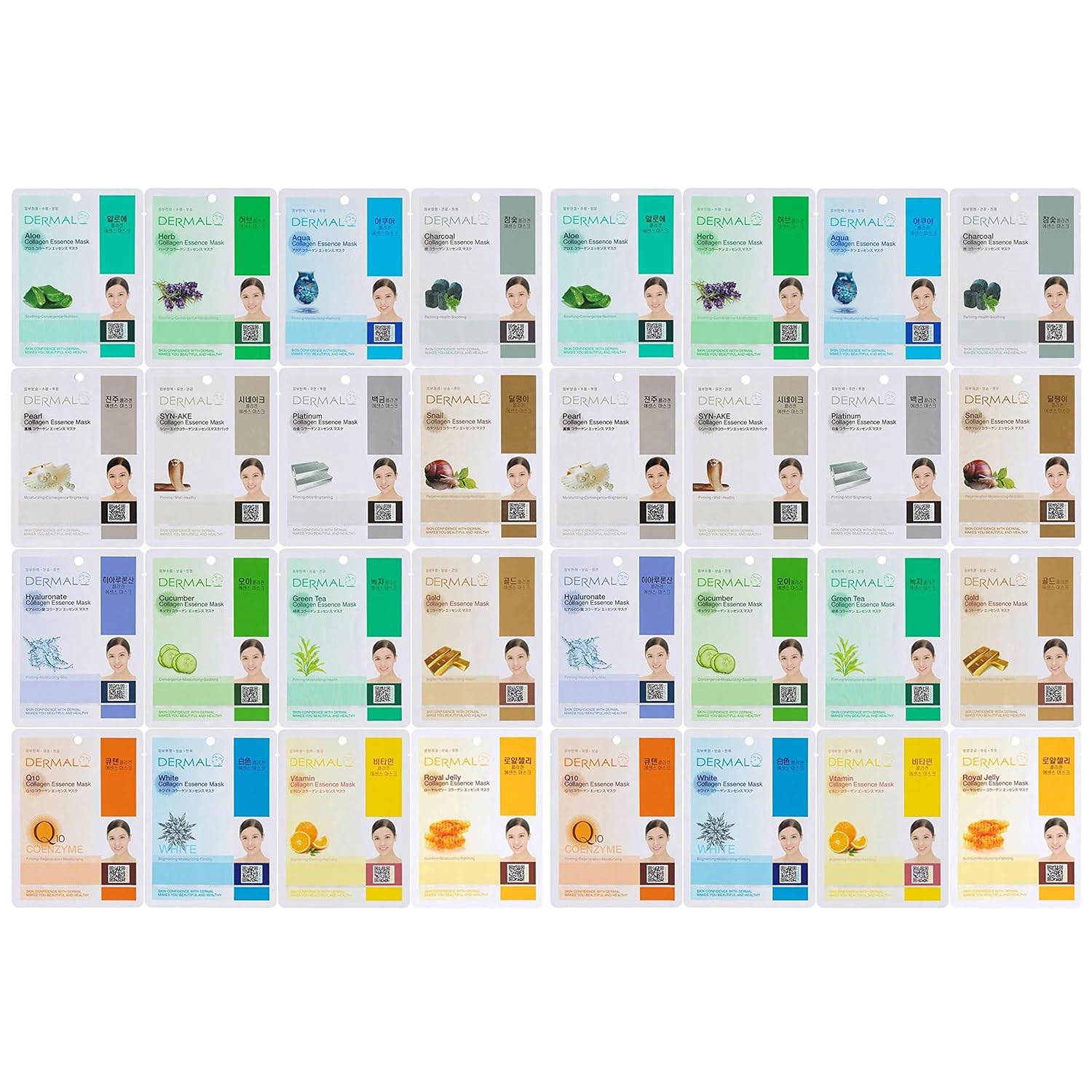 DERMAL Korean Collagen Face Mask – Hydrating & Soothing Sheet Mask with Panthenol – Hypoallergenic Calming Moisture Care for All Skin Types – 32 Combo Pack