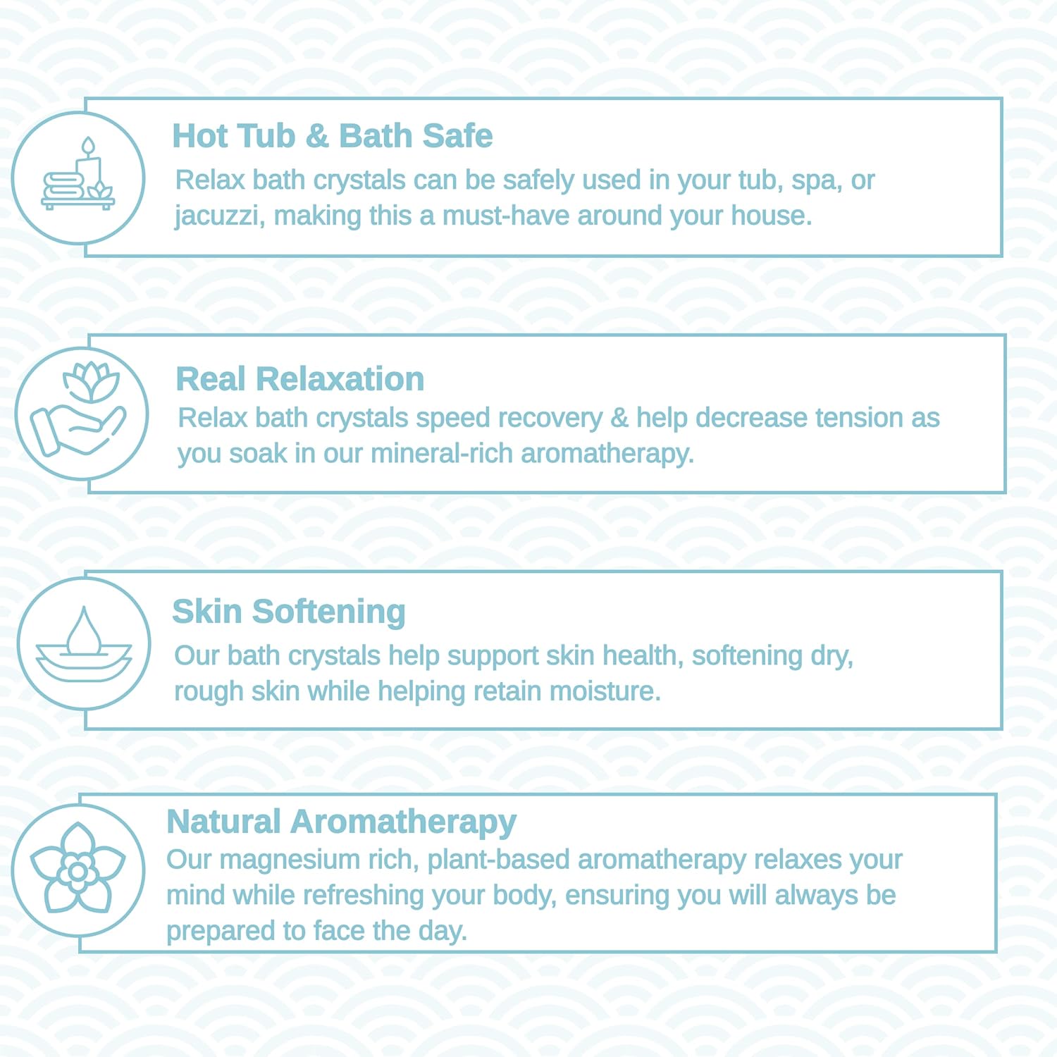 - CRAFTED WITH CARE IN THE USA: Proudly made in the USA, Relax Spa & Bath blends premium ingredients with thoughtful design for a soak that’s easy to use, easy to love.`