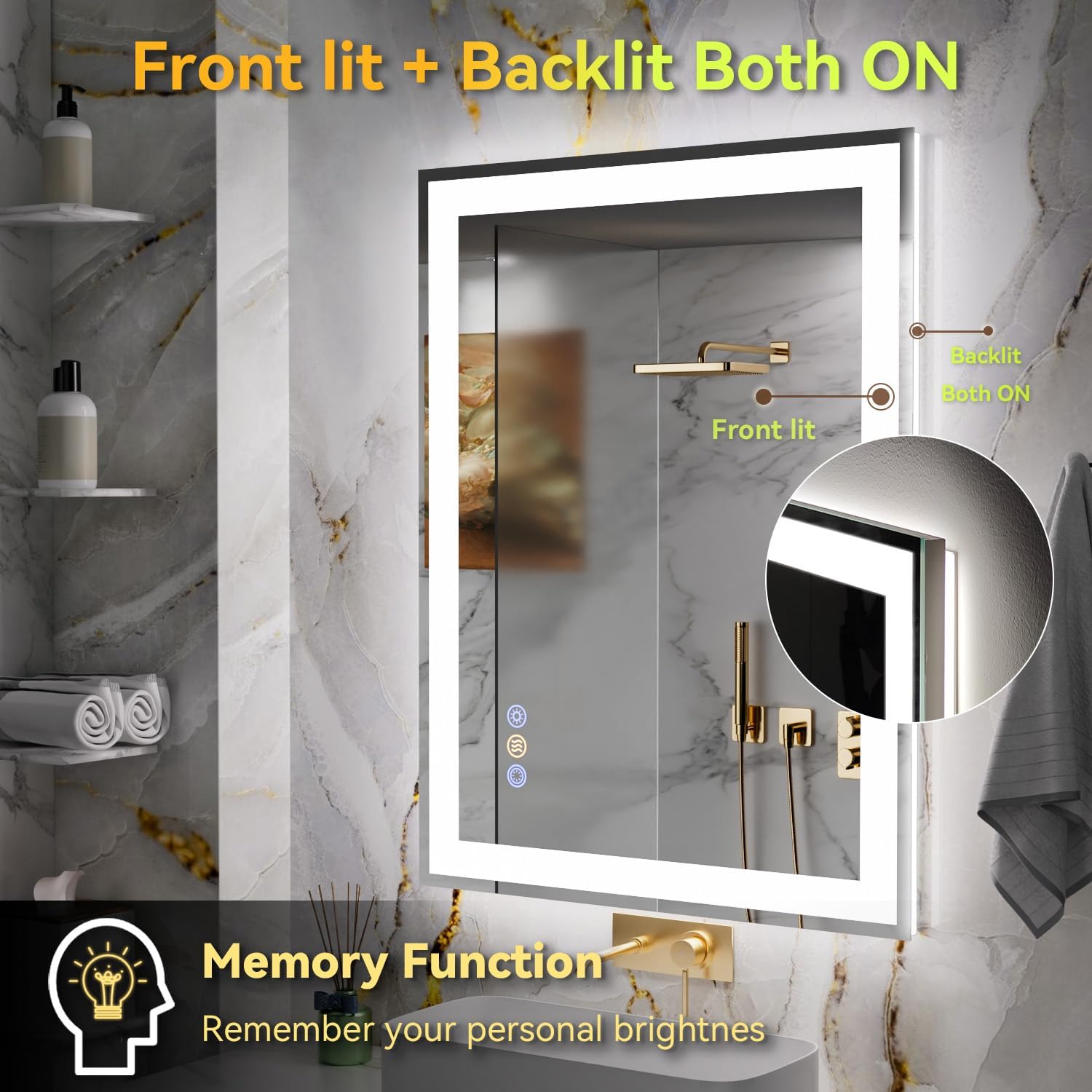 - 【24x36in Smart Mirror with Memory & Anti-Fog Function】This smart LED bathroom mirror is equipped with a memory function that recalls your last brightness color temperature and anti-fog settings, saving time every time you use it. The built-in fast-heating anti-fog feature activates a safe heating coil that begins clearing the mirror from the center outward within 3 minutes. Smart, safe, and efficient—designed for modern daily use