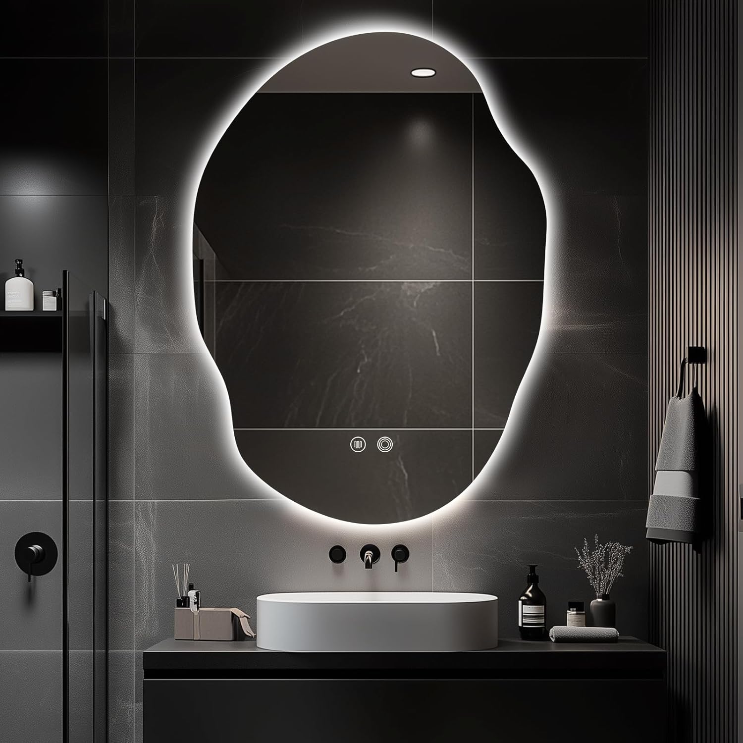 - Eco-friendly 5MM Asymmetrical Bathroom Mirror with Light: This LED bathroom mirror is made with copper-free, environmentally friendly materials and a silvered reflection layer for a clear and sharp image.