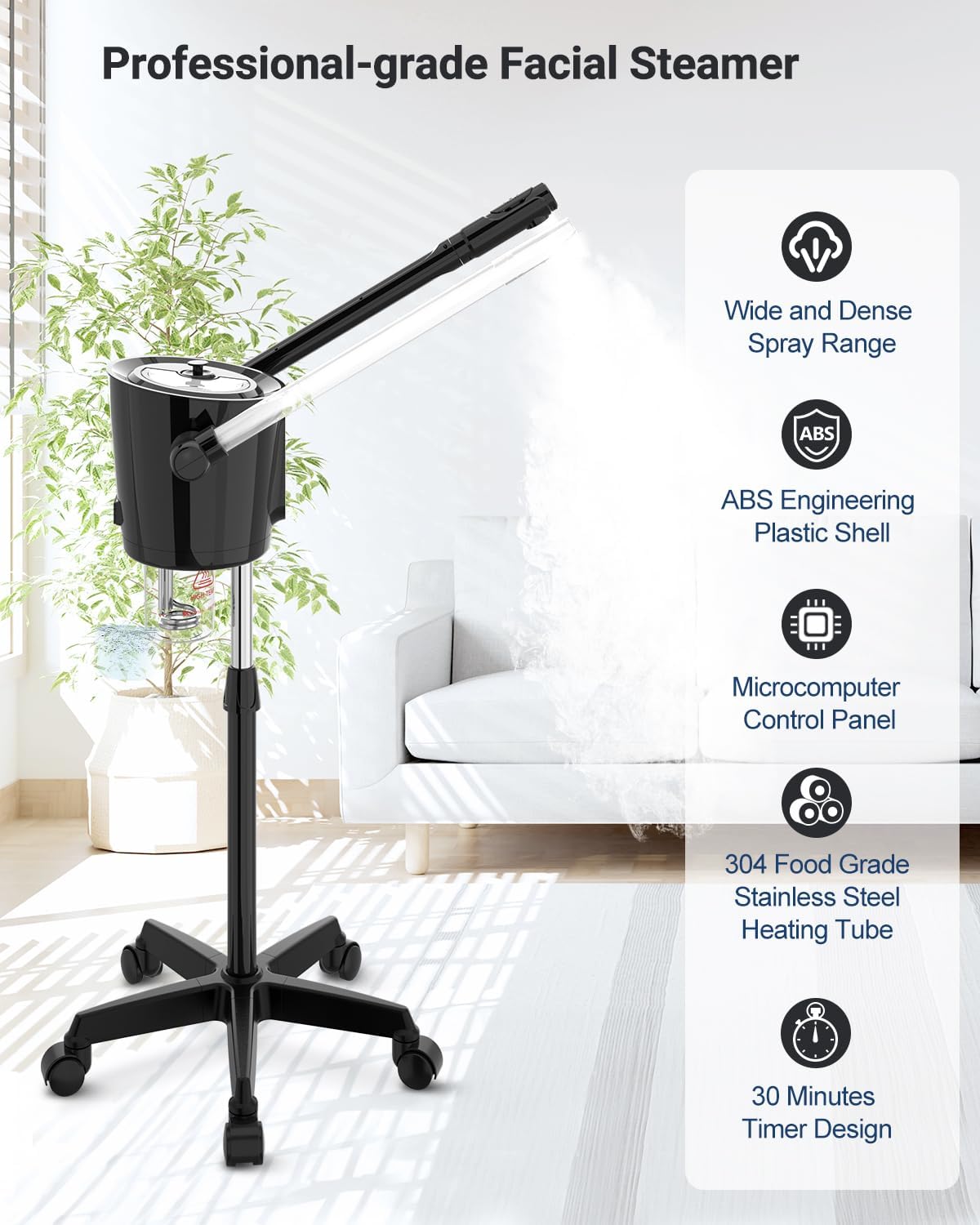 - [Practical & Easy-to-Use Design] The Kingsteam facial steamer features a 360° rotating nozzle, adjustable arm, and height-adjustable mobile stand with a telescopic tube, designed to accommodate your different needs and settings. Whether sitting or lying down, you can easily enjoy spa treatments for your face and neck. The detachable water cup is simple to clean, and we recommend changing the water regularly for optimal performance. The stable, mobile stand with wheels allows for easy movement and secure positioning