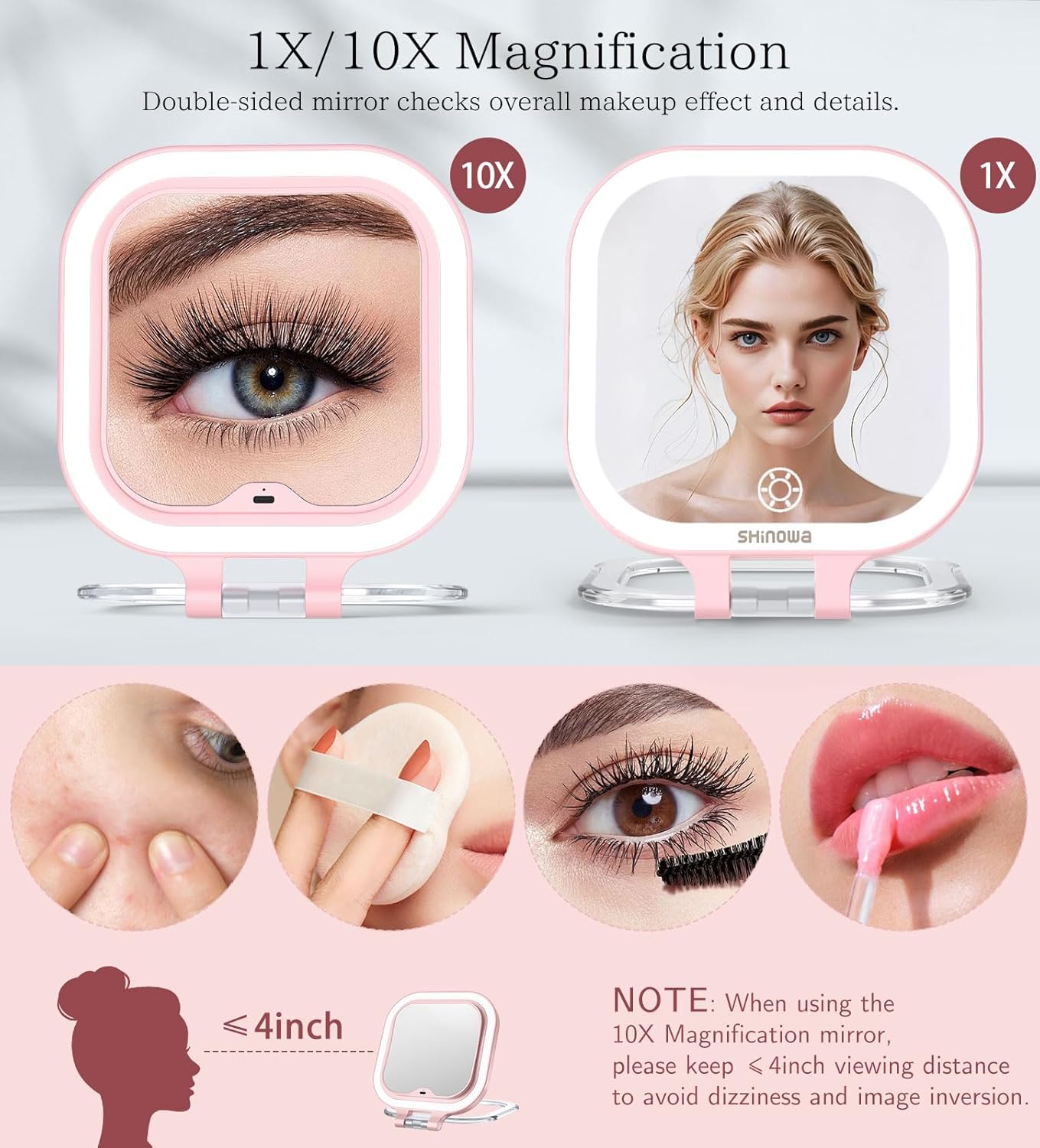 Shinowa Rechargeable Travel Makeup Mirror with 72 LED Lights, 1X/10X Magnifying Vanity Mirror with 3 Color Light, Folding Stand, 7 Inch Portable Dimmable Double Sided Compact Lighted Mirror, Pink