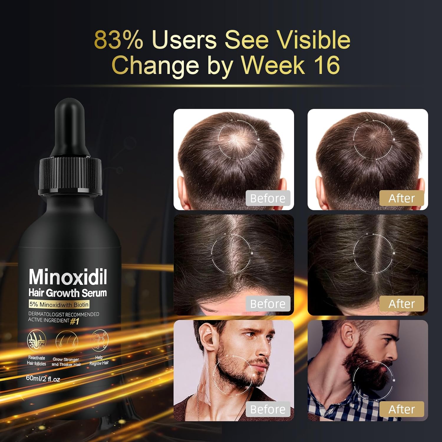 - BOOST YOUR CONFIDENCE WITH 5% MINOXIDIL: Our minoxidil for women and minoxidil for men hair is the #1 dermatologist-recommended treatment for hair loss. It strengthens hair follicles, reduces thinning, and accelerates natural regrowth. Whether you're dealing with a receding hairline, bald spots, or overall hair thinning, this formula works effectively. With regular use, you’ll notice stronger, healthier hair that helps you look and feel your best. If discontinued, regrown hair may gradually revert to its previous state.