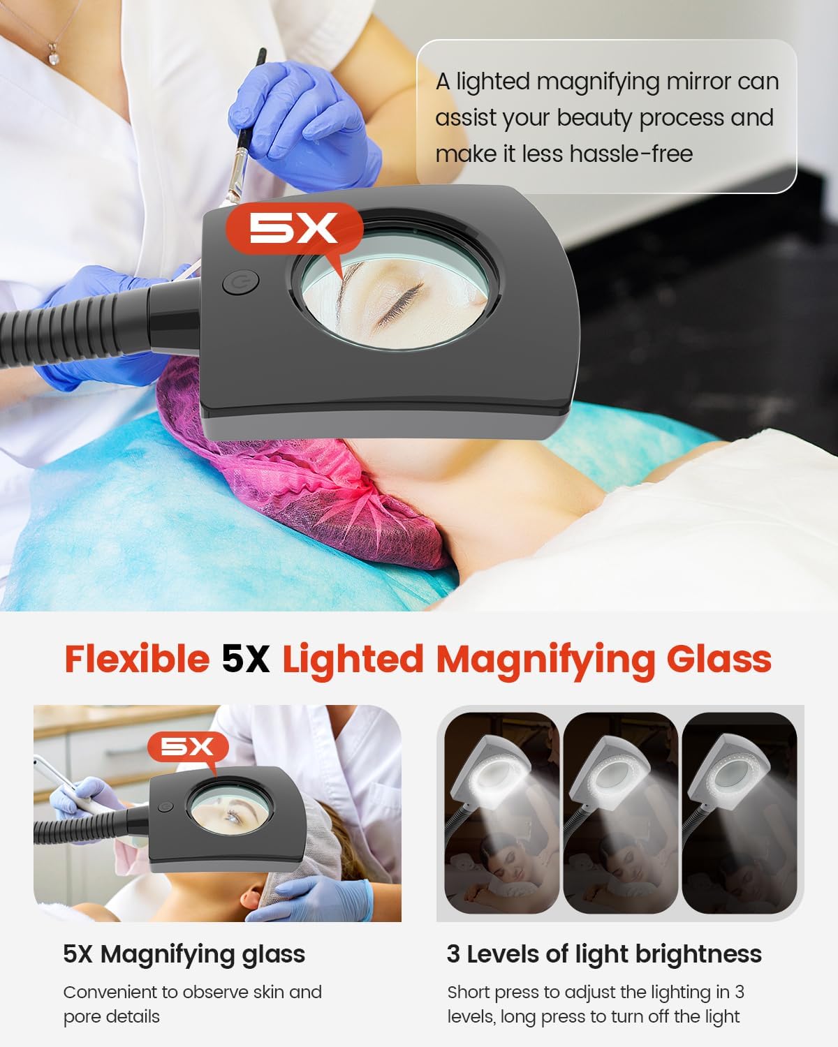 - 🔬 5X Magnification + Pro-Grade LED Illumination. See every detail! Built-in 5X ultra-clear magnifying lens combined with 3-level adjustable LED light provides unparalleled clarity. The 8500K true daylight color temperature minimizes eye strain and reveals genuine skin tone. Easily identify blackheads, blemishes, and imperfections, ensuring targeted, effective treatments for a flawless complexion.