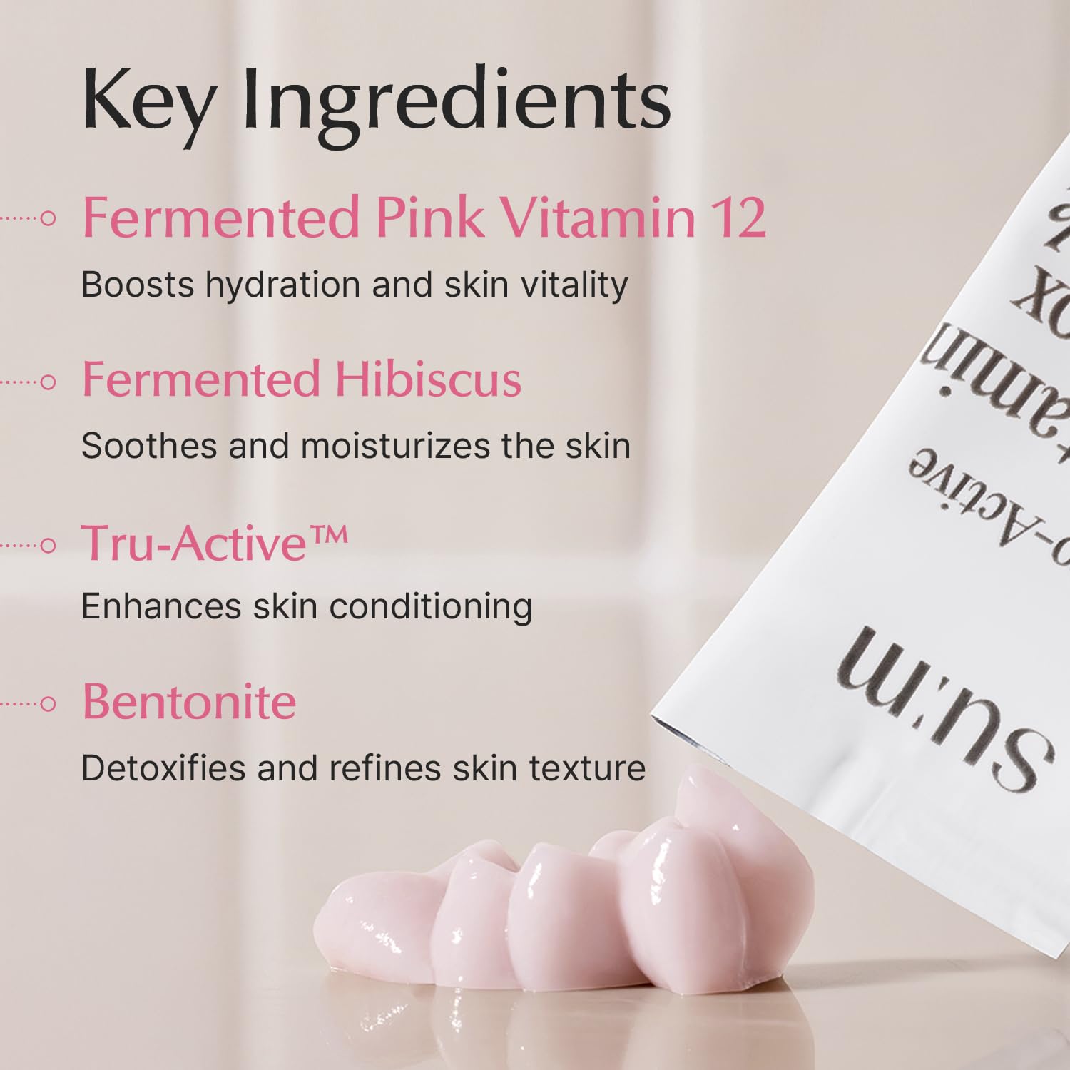 - SU:M MICRO-ACTIVE PINK VITAMIN BUBBLETOX MASK PACK (4ml x 14ea) – A foaming mask that creates dense pink bubbles to remove impurities, deeply cleanse pores, and hydrate the skin. Formulated with Fermented Pink Vitamin 12, Hibiscus, Kaolin, and Bentonite for skin detoxification and revitalization.