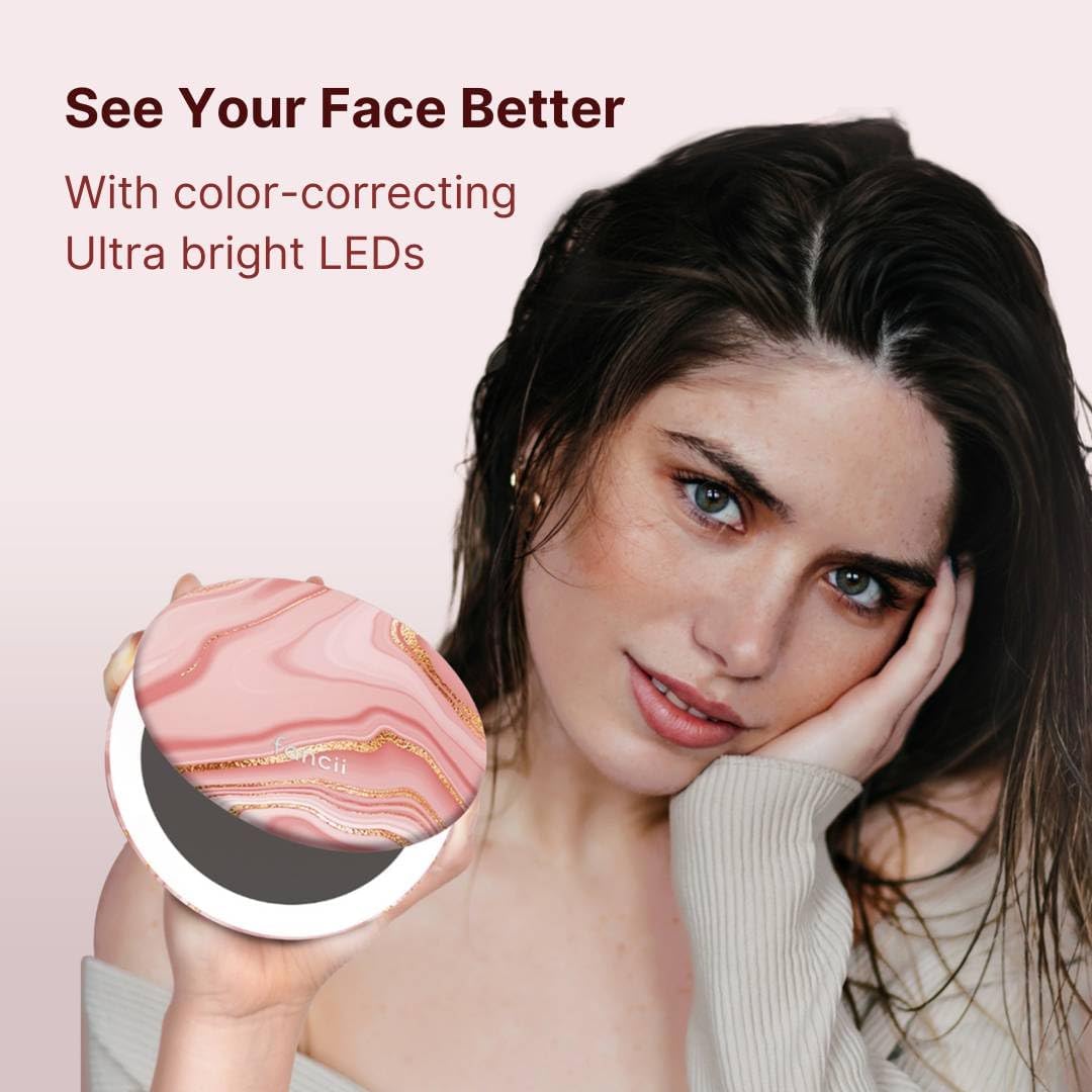 Fancii Taylor LED Lighted Travel Makeup Mirror, Rechargeable, 10x /1x Magnifying, Tru-Glow Lighting System, XL Large 5” Wide | Compact Mirror for Purses (Marble Rose)