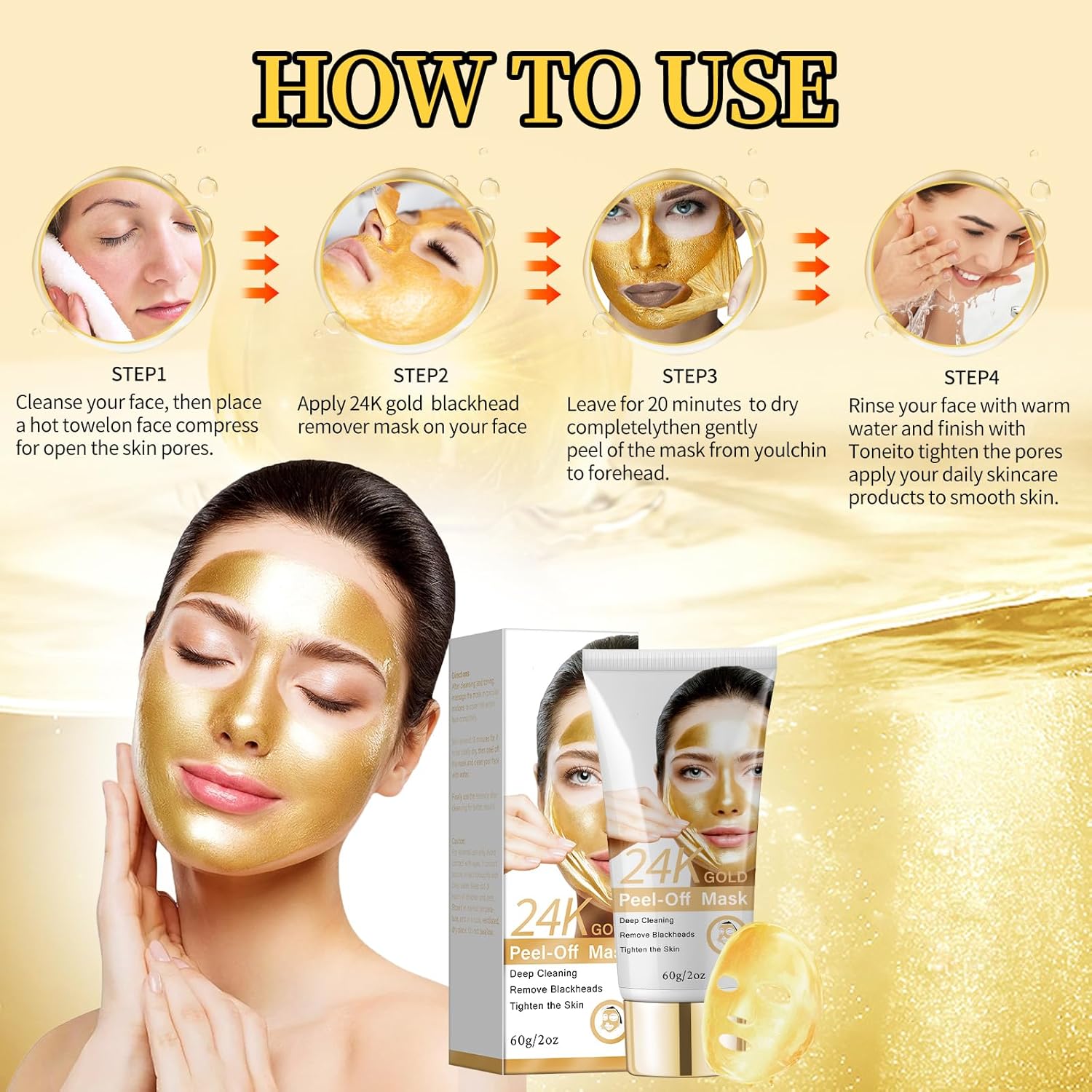 - Deep Cleansing Mask: 24k gold peel off mask will draws out blackhead, impurities, dirt , excess oil and pollutants effectively. give your skin luxurious spa treatment, make your skin revealing a pure & glowing looking!